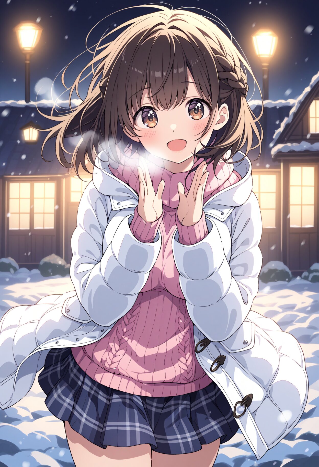 まだ暗い早朝の田舎の風景、雪が降っている、風が吹いている、ふわふわもこもこの白いダウンジャケット、ピンク色のニットのセーター、チェック柄の水色のミニスカート、両手を上げて上を向いている、白い息を吐く、口を開けて笑っている、かわいい笑顔、かわいい、キラキラ、女の子っぽい