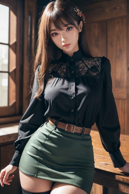 masterpiece, hyper detailed, 8K, hyper detailed illustration,extremely detailed CG, Japanese woman, 23yo, (cute:1.1), (pretty:1.1), hyper detailed face, hyper detailed eye, beautiful eye, extremely detailed, medium hair,(bangs:1.1), thin, tall, perfect anatomy, perfect proportions, extremely detailed body, blouse, short skirt, thighhighs, hyper detailed background,