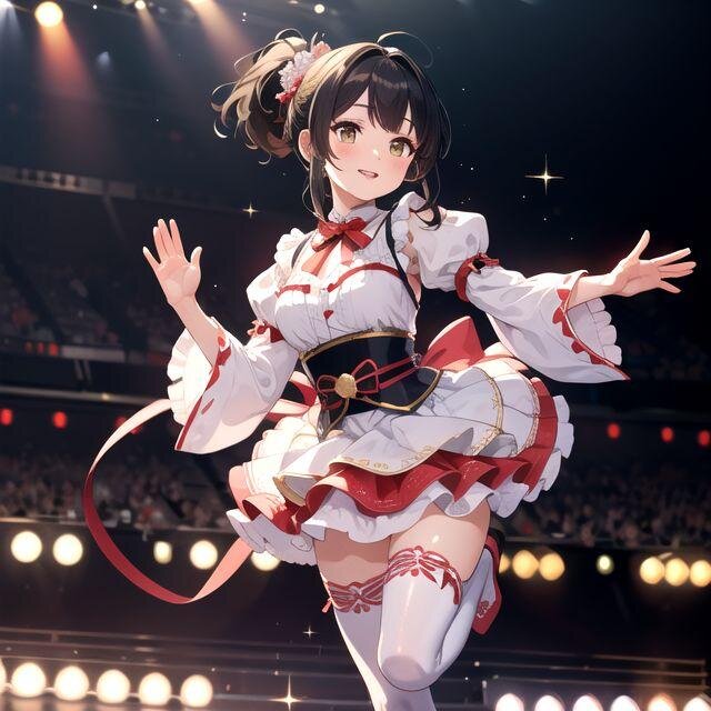 黒髪ポニーテール、中乳、((loli0.7))、zettai_ryouiki、best quality, masterpiece, photorealistic, realistic, ultra high definition, ray tracung、blurry background、cherry pink lip、standing on one leg, front leg bent inward, toes pointed, slight hip shift, upper body leaning forward a little, both hands raised and waving cheerfully, soft smile, energetic idol stage pose,bright yellow fluffy idol stage costume, short frilled dress, layered tulle skirt, white lace trim, many ribbon accents, puff sleeves, fitted waist, bold chest cutout with heart-shaped opening, subtle sparkle fabric, white thigh-high socks, absolute territory, white idol boots, sweet and elegant Japanese idol style,masterpiece,best quality,high resolution,