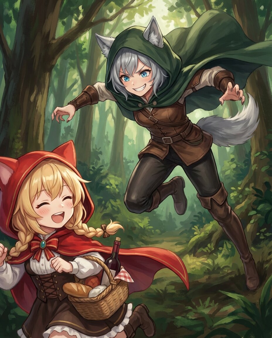 この二人が童話「赤ずきん」を演じるシーン。 灰髪狼娘のベシスちゃんが狼男役。 ベシスちゃんはフード付きマントを羽織ったタイトパンツ+ブーツの狩人のような姿。 フードの中から狼耳が覗いている。 金髪猫耳娘のルルが赤ずきん役。 猫耳型の赤ずきんを被っている。 ルルはパンやワインが入ったかごを持っている。 ベシスちゃんがメインで大きく映る森の中のシーン。 悪い笑顔でルルを追いかけ、ダイナミックに飛びかかっている。 ルルは画面手前の端に映り、とても楽しそうに逃げている。 境界線がはっきりしない絵画のような質感のイラスト。 アスペクト比4:5で生成して。