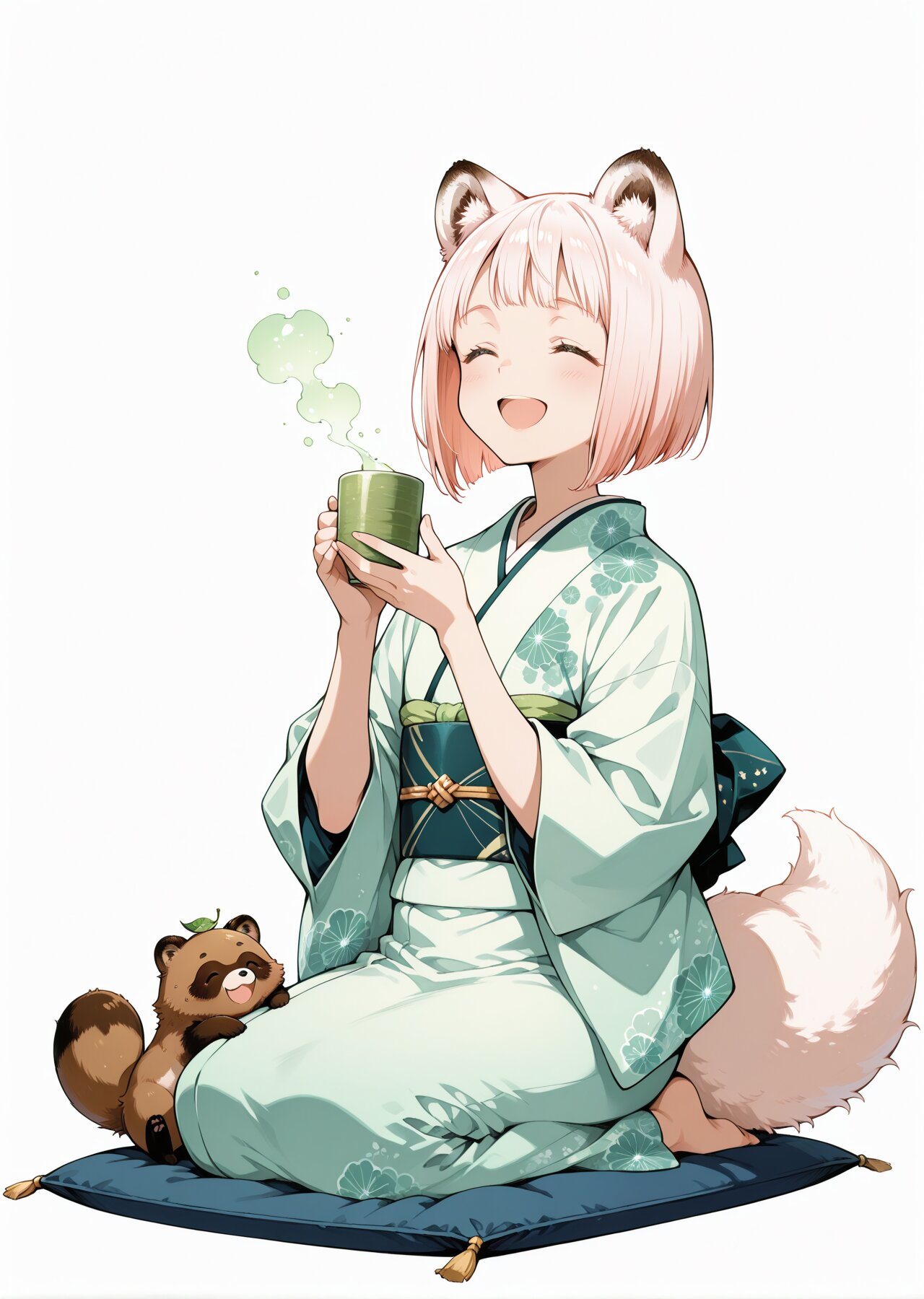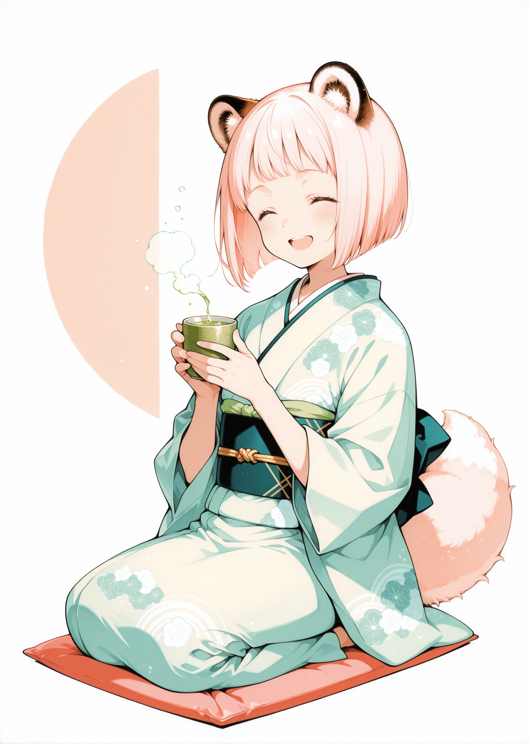 Best quality, Masterpieces, simple background, negative space, anime-style illustration, white background, fine detail, 1girl,flat chest,(light red short bob hair:1.4),wearing a modern style mint green pastel kimono with subtle asanoha geometric patterns,deep navy obi with thin silver line tied simply,fluffy tanuki ears and fluffy tail spreading naturally behind her, smile, open mouth, closed eyes, seiza, zabuton, drinking green tea, japanese room, two-tone background, soft pastel colors, minimalistic, solid color, no texture