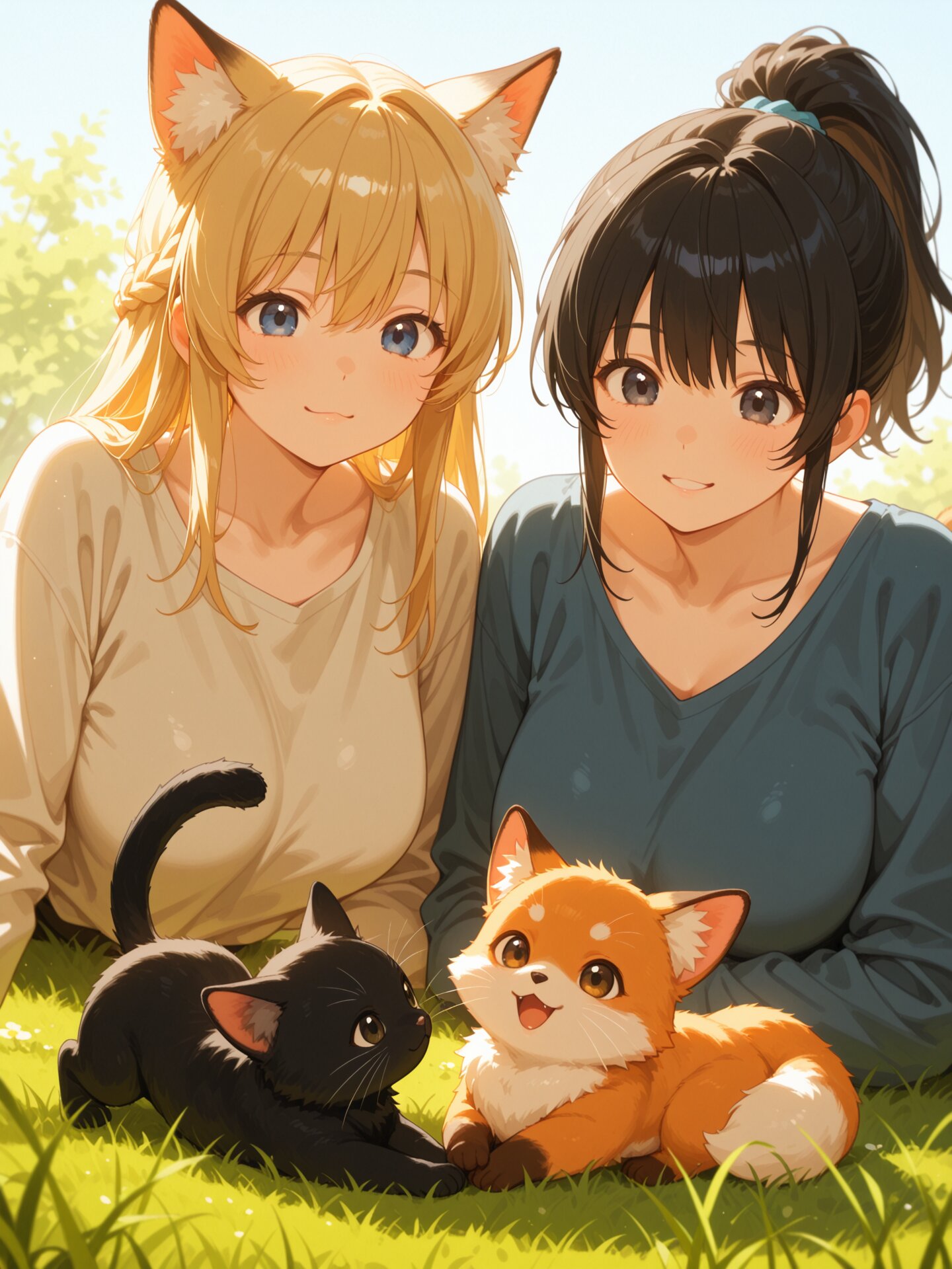 (masterpiece, best quality, high resolution, anime illustration, soft colors, gentle lighting, smooth shading, clean illustration), cute small fox cub and black cat, playfully tumbling and pawing at each other, soft fluffy fur, tiny paws, gentle expressions, foreground focus, small animals playing together, in the background, gentle smiling characters, warm and kind expression, soft eyes, relaxed posture, watching over them quietly, loose long-sleeve top, comfortable and modest outfit, 2girls, side by side, together, friendly vibe, upper body, BREAK (girl A:1.15), left side, blue eyes, long blonde hair, hair between eyes, braid, natural small cat ears, natural cat tail, medium breasts, :3, BREAK (girl B:1.15), right side, 16yo, cute face and eyes, big breasts, black hair, clear black eyes, single short ponytail hair, high ponytail, cute and lovely, BREAK distinct faces, different hairstyles, balanced composition, BREAK slight depth of field, soft focus background, warm and peaceful mood, sunlit grass field, soft afternoon light, storybook illustration style, soft colors, smooth shading, highly detailed, wholesome, heartwarming