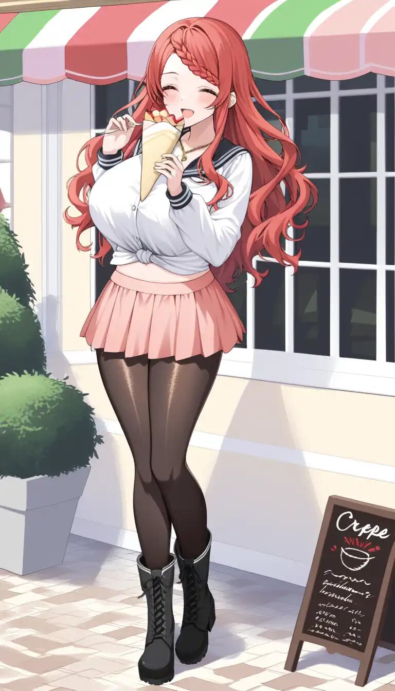 [masterpiece]++, [best quality]++, [ultra detailed]++, [8K]++, [holding crepe]++, [eating crepe]++, [eating]++, [school uniform]++, [summer uniform]++, [long sleeves]++, [pink miniskirt]++, [full body]++, [black pantyhose]+, 1girl, solo, [huge breasts]++, perky breasts, hanging breasts, curvy, collarbone, cleavage, gold necklace, [midriff]+, [boots]++, [tall]++, [long hair]++, [straight hair]++, [shiny skin]++, [shiny clothes]++, [shiny pantyhose]++, smile, blush, open mouth, closed eyes, [legs together]++, standing, [In front of the crepe shop]++, outdoors, evening, pavement, [wavy hair]++,