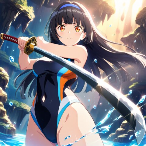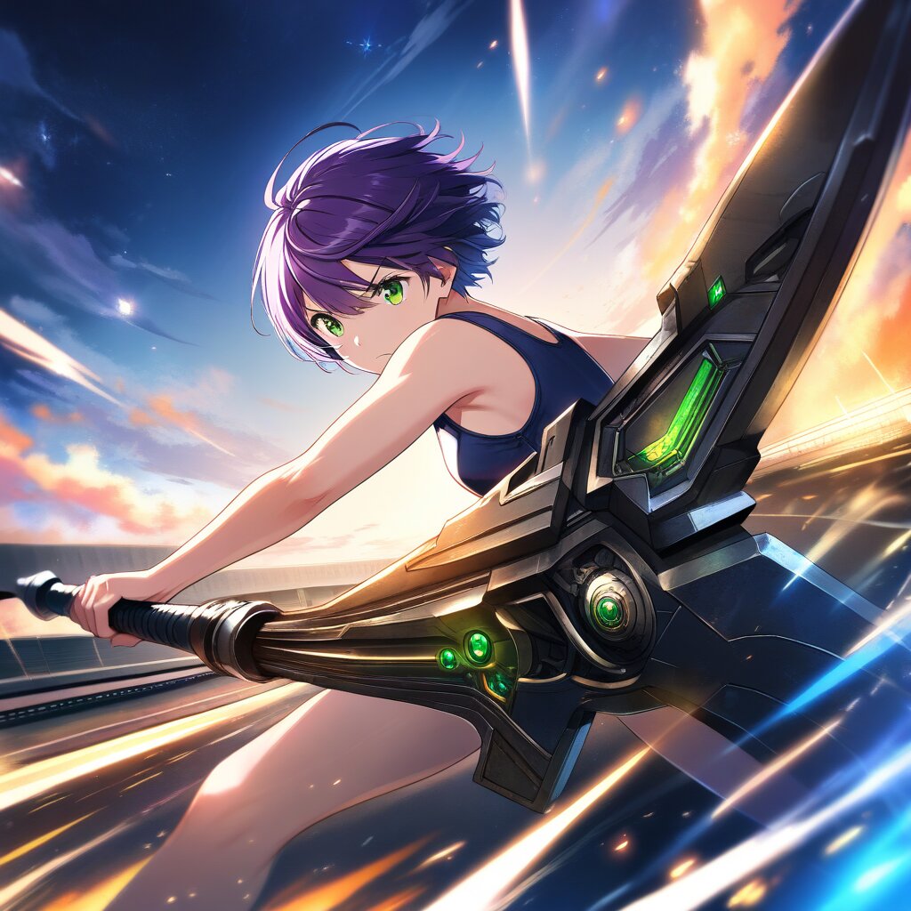 ((masterpiece)), ((best quality)), (ultra-detailed), illustration,highway,midnight, at dusk,(school swimsuit), navy blue, short hair, purple hair, green eyes,Holding a weapon in hand, gripping Battle Axe,Battle scene,serious,Dynamic Angle,Dynamic Pose,Serious
