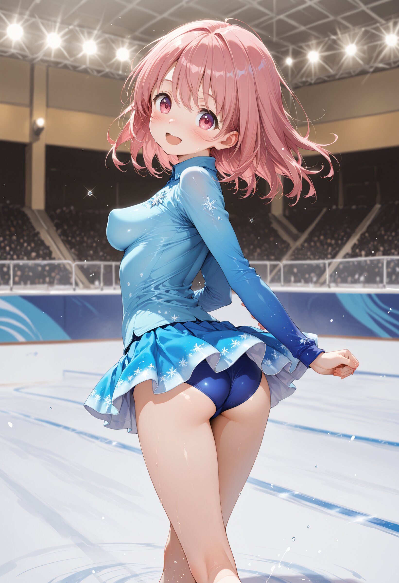 masterpiece, best quality, amazing quality, general, fine detail, official art, 1girl, (loli:1.2), beautiful pink hair, beautiful eyes, blue dress, perfect fit, miniskirt, figure skating, skating rink, show time, large breasts, (perky breasts:1.2), impossible clothes, blue pantie, slim legs, slim hip, blush, happy, dynamic action,