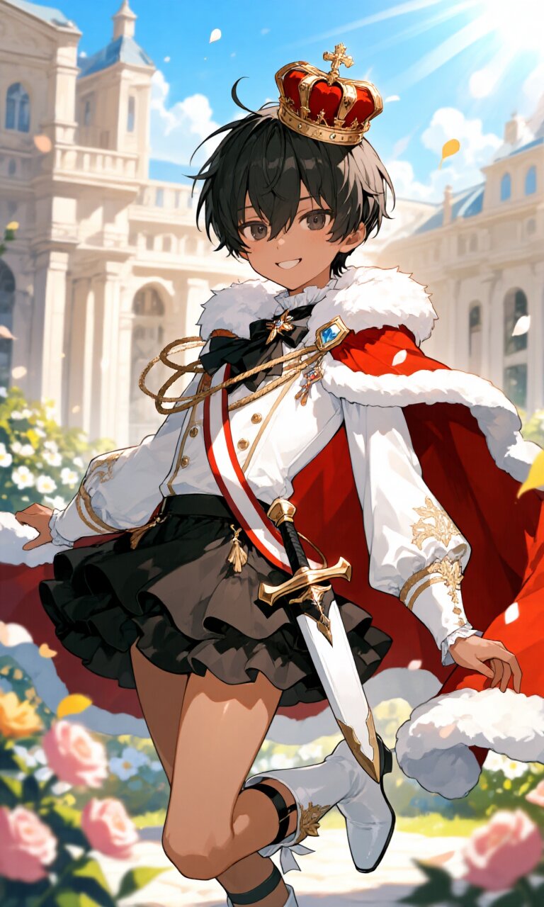 a 16-year-old boy with short black hair that reaches his neck, featuring hair between his eyes, big dark brown eyes, and a delicate, fair-skinned face with a gentle smile. He has a (tan skin) tone, a (wiry) and (athletic) build, and wears a (White luxurious Prince costume:1.6) with long sleeves, a (luxurious Red Cape:1.3), and a (luxurious Black mini skirt:1.4). His attire is completed with (white luxurious Boots:1.3) and a (Dagger on waist:1.3). A (luxurious crown on head:1.4) rests atop his head, enhancing his princely appearance. His pose is cute and cheerful, exuding charm and confidence. The background features a grand Palace with Rococo architecture, romantic academia elements, and an outside setting filled with flowers. The scene is set in the afternoon, with a blue sky, sunlight, sunbeam, shining light, and lens flare adding a dreamy atmosphere. The style of the image is highly detailed, with intricate textures in the clothing and surroundings, emphasizing a masterpiece-quality composition.