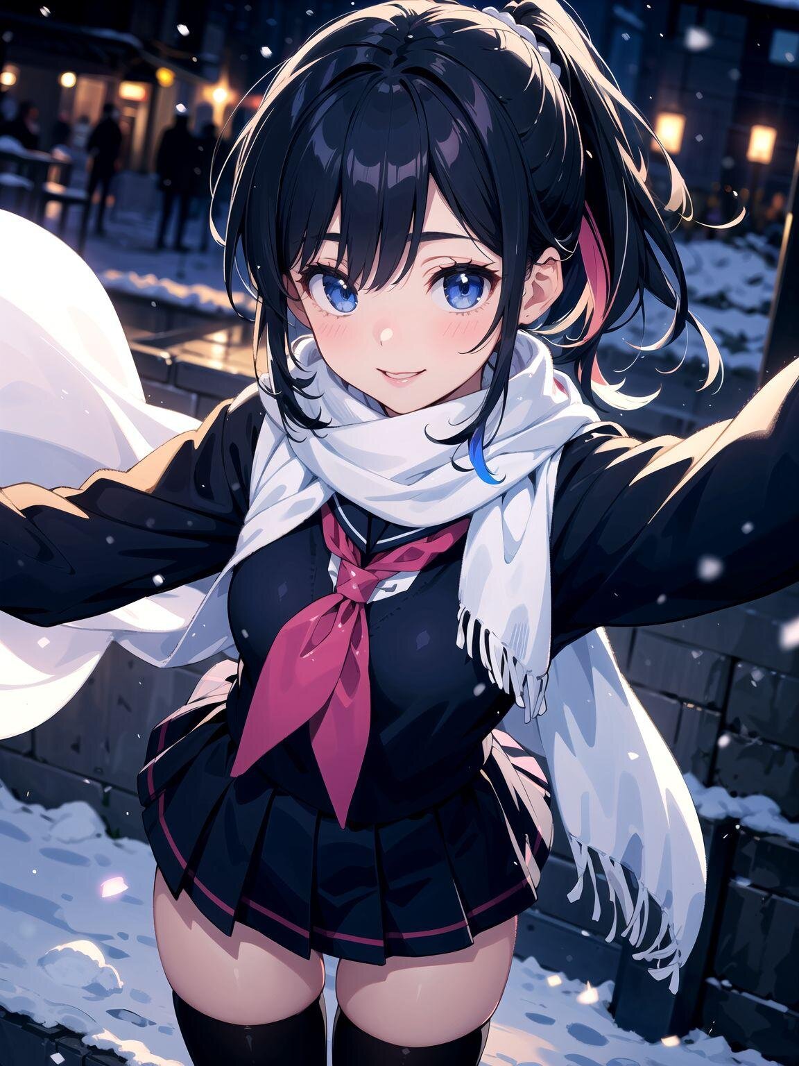 ultra high definition, ray tracung、blurry background、cosmetics、cherry pink lip、Winter sailor uniform, white scarf around the neck, high angle, falling snow, natural light, girl with open arms, night, city,