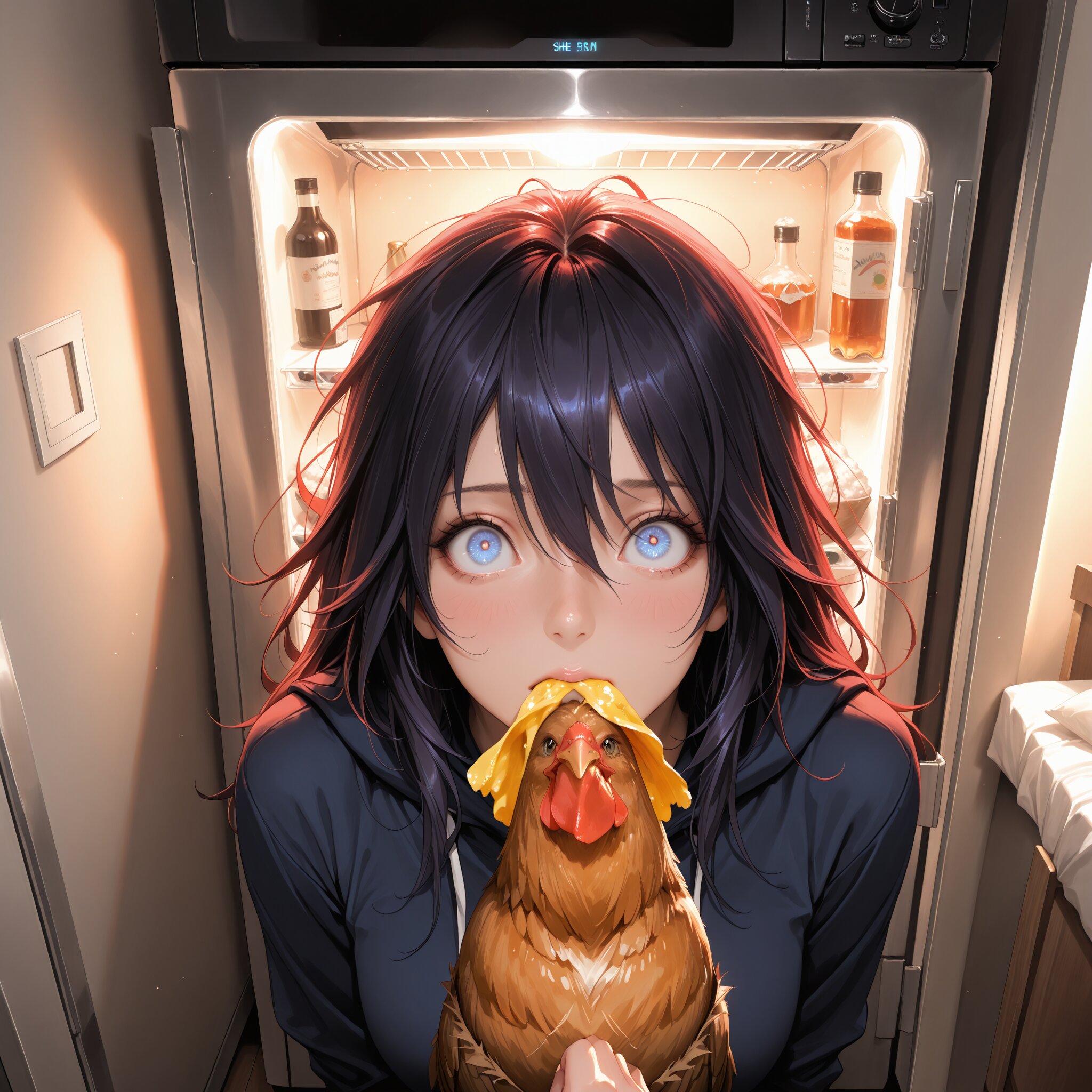 masterpiece, best quality, photorealistic, sharp focus, cinematic lighting, depth of field, beautiful composition, vibrant colors, ultra high res, 8K, highly detailed, masterpiece, best quality, very detailed, (masterpiece:1.2), (best quality), (ultra-detailed), 1girl, solo, POV from inside a dark refrigerator, looking up at a gorgeous woman opening the door, bright cold white light from the fridge illuminating her face, she is caught in the act of stuffing a whole rotisserie chicken into her mouth, messy bed hair, wide eyes in shock, midnight kitchen background, hilarious "caught red-handed" expression, realistic textures, dramatic lighting, cinematic shadows.