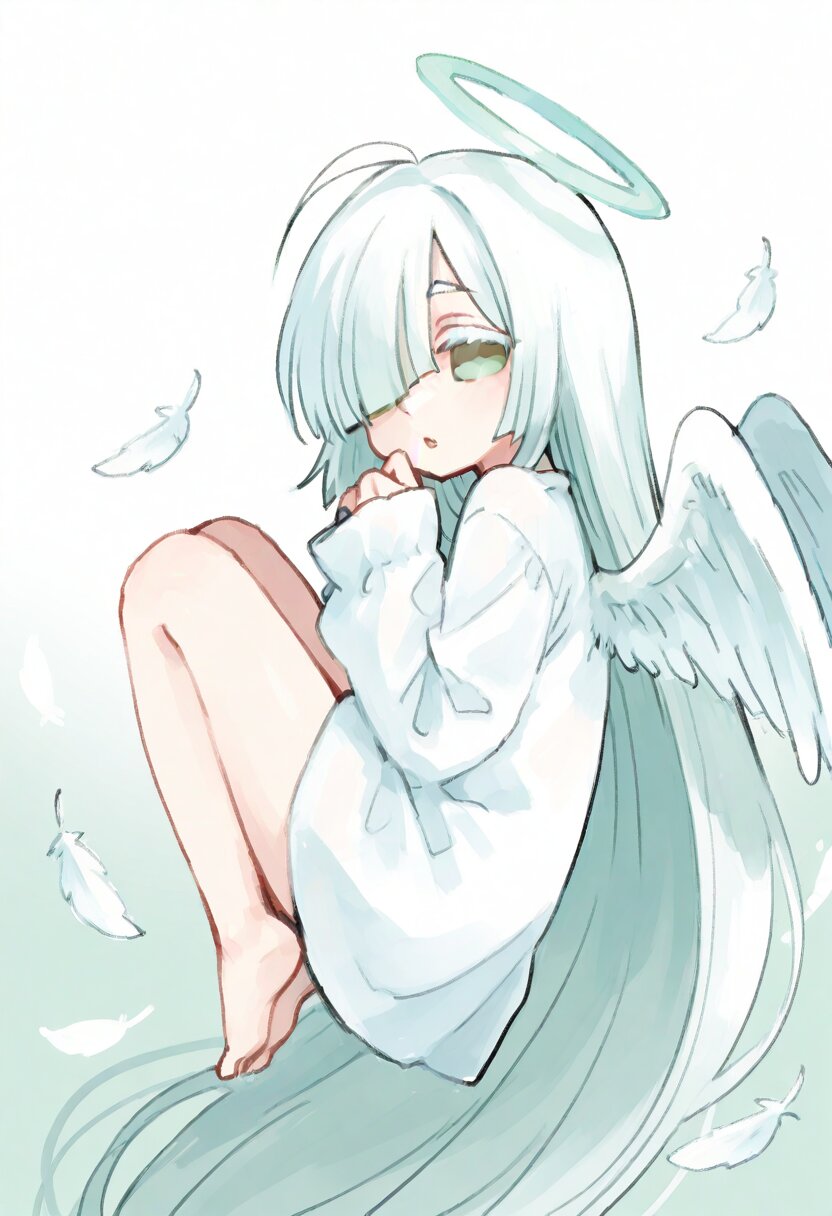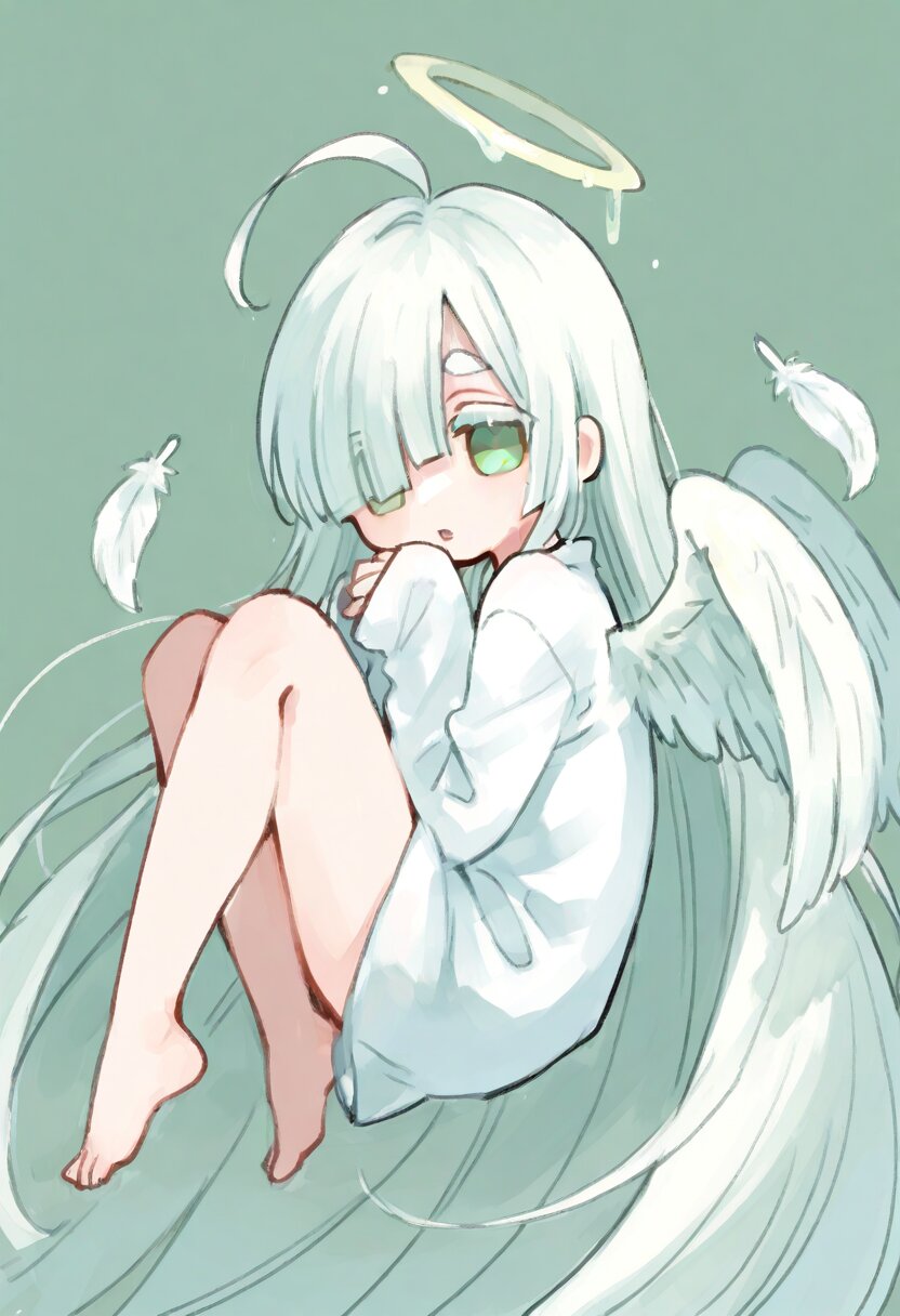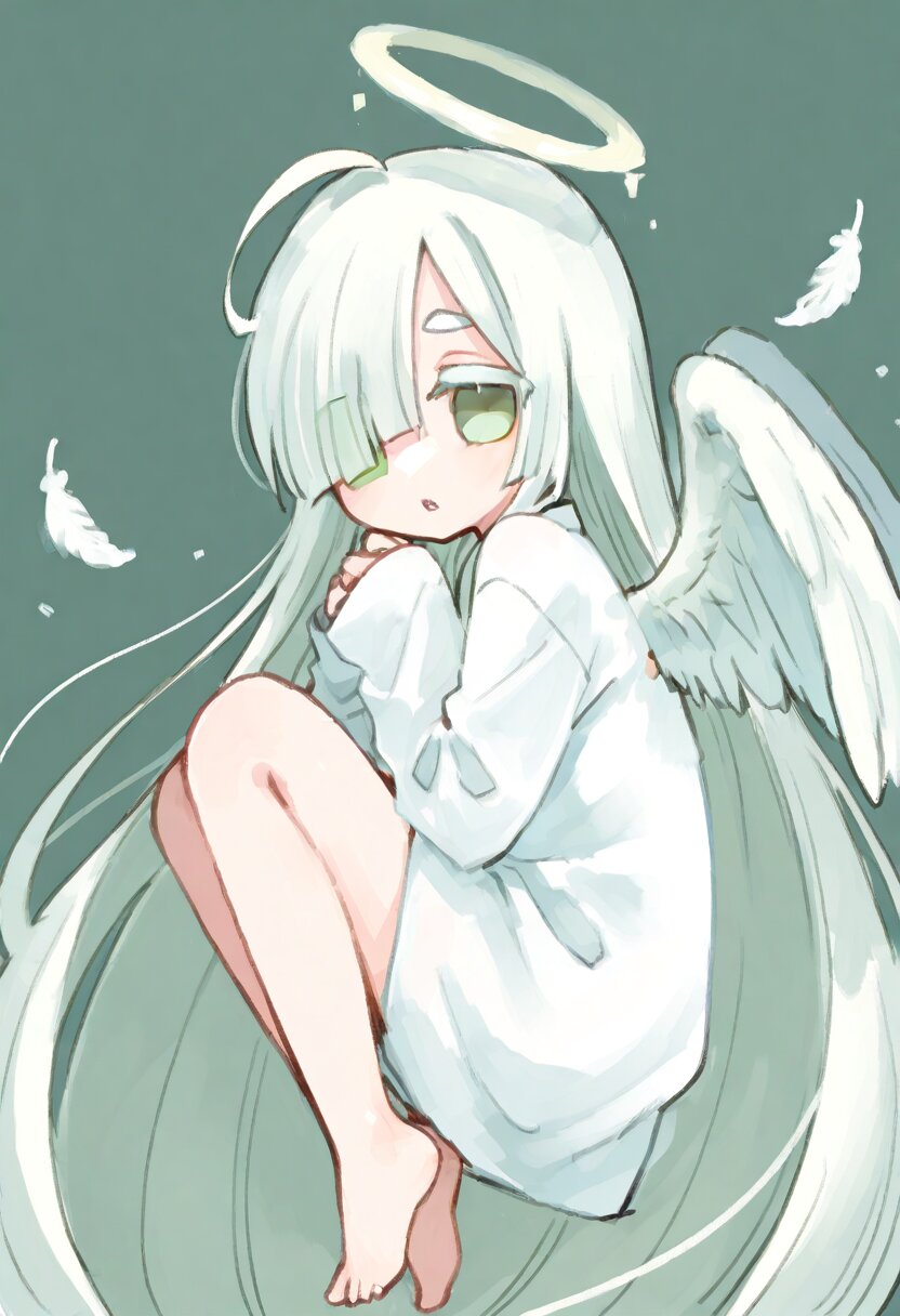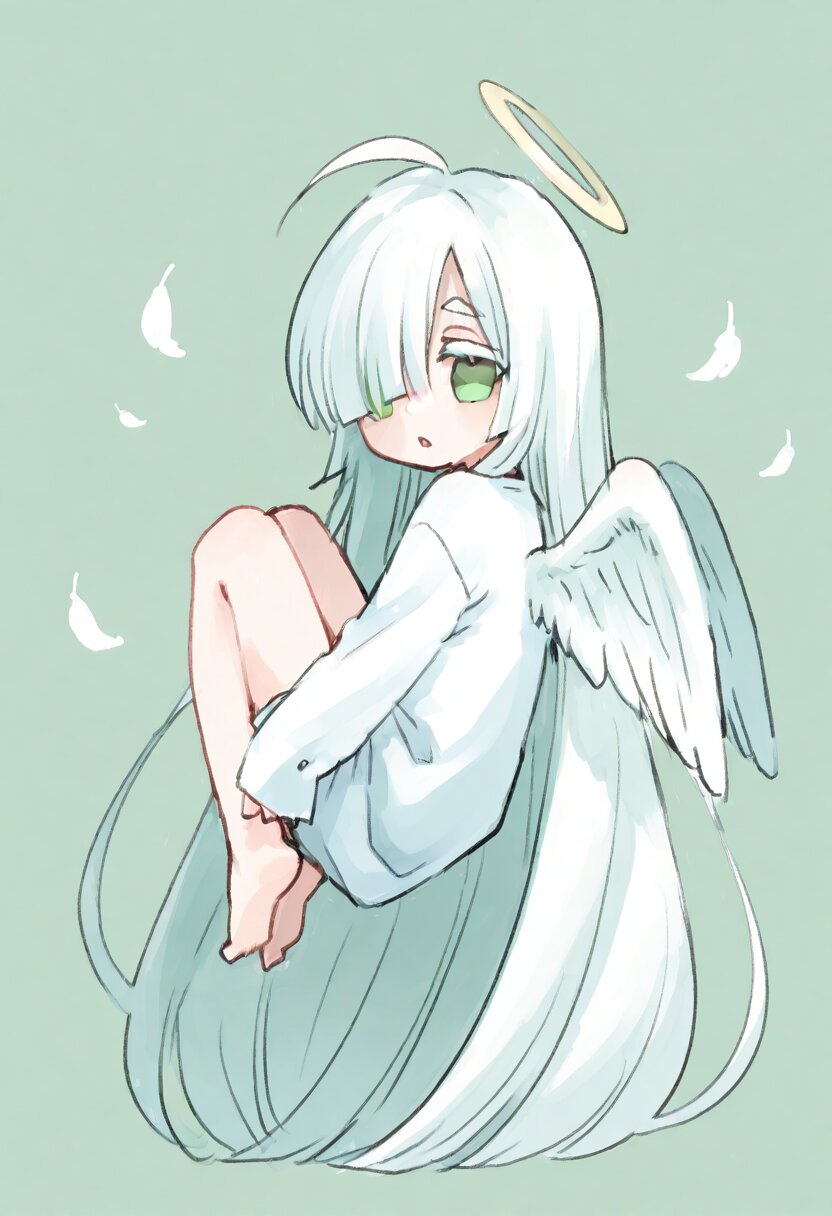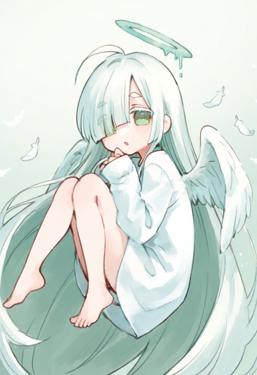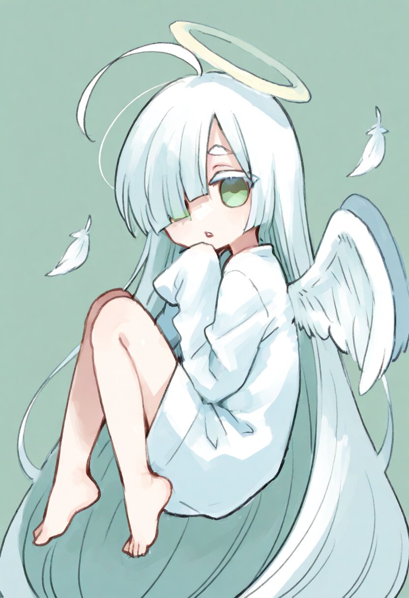 <lora:inmnstyleilxl:0.9>, chibi, solo, 1girl, floating, knees up, look back, looking at viewer, flattering white feathers, (bright white hair), absurdly long hair, blunt bangs, white thick eyebrow, white colored eyelashes, (hair over one eye), ahoge, mint green eyes, white dress, sleeves past wrists, barefoot, angel wings, halo, parted lips
