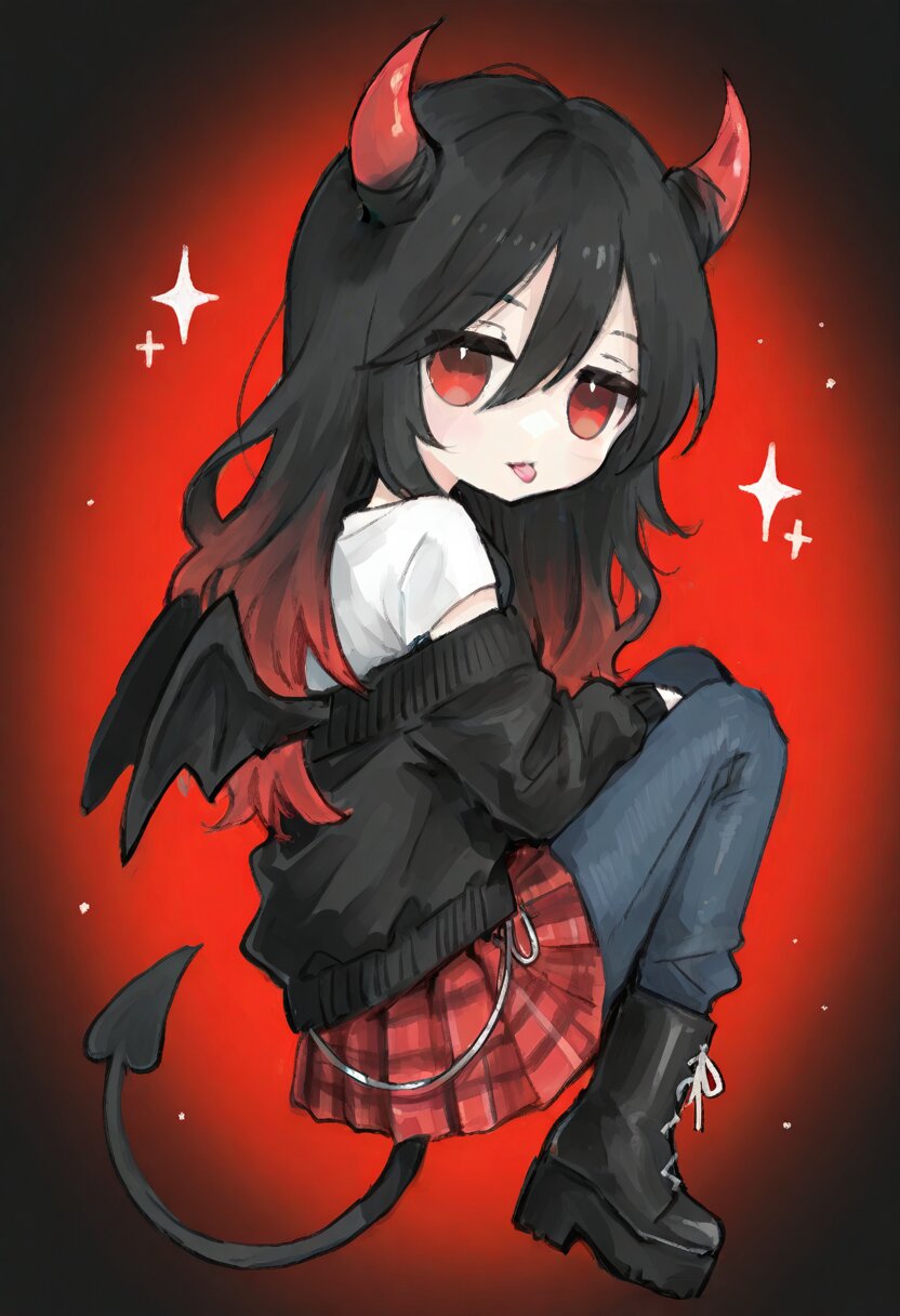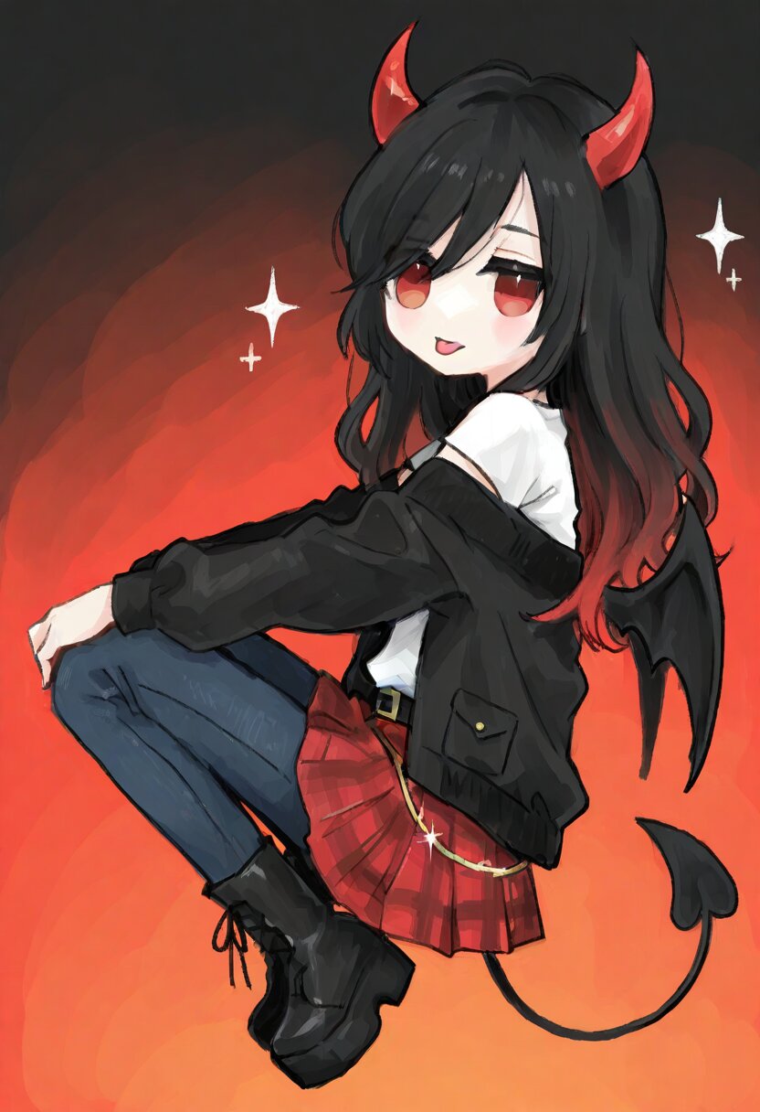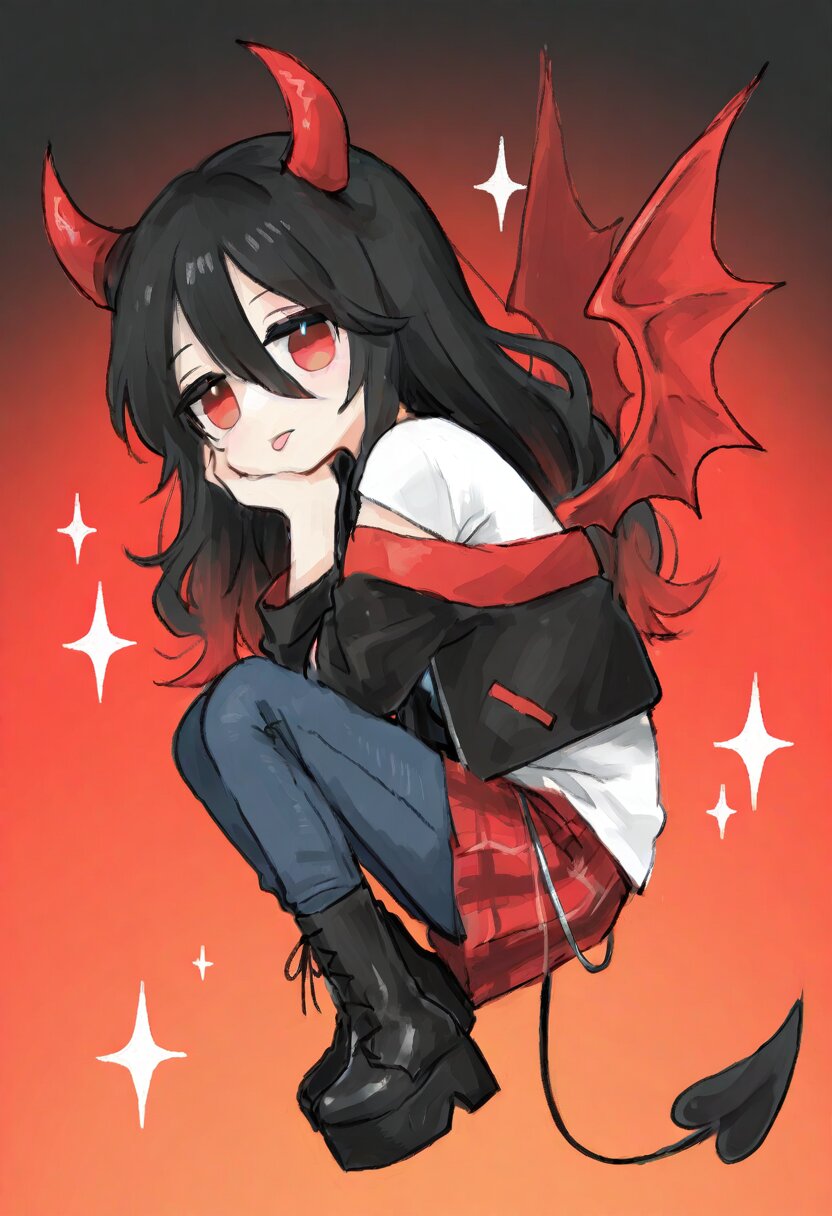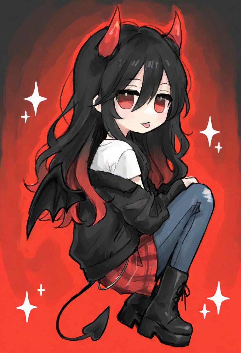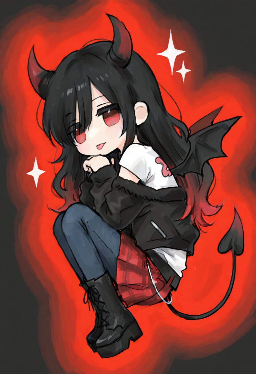 <lora:inmnstyleilxl:0.9>, chibi, solo, 1girl, floating, knees up, look back, looking at viewer, sparkling aura, black hair, long hair, wavy hair, long bangs, red colored tips hair, red eyes, jitome, black jacket, offshoulder jacket, white t-shirt, red plaid skirt, hip chain, skinny jeans, black platform boots, :p, devil wings, devil horns, devil tail