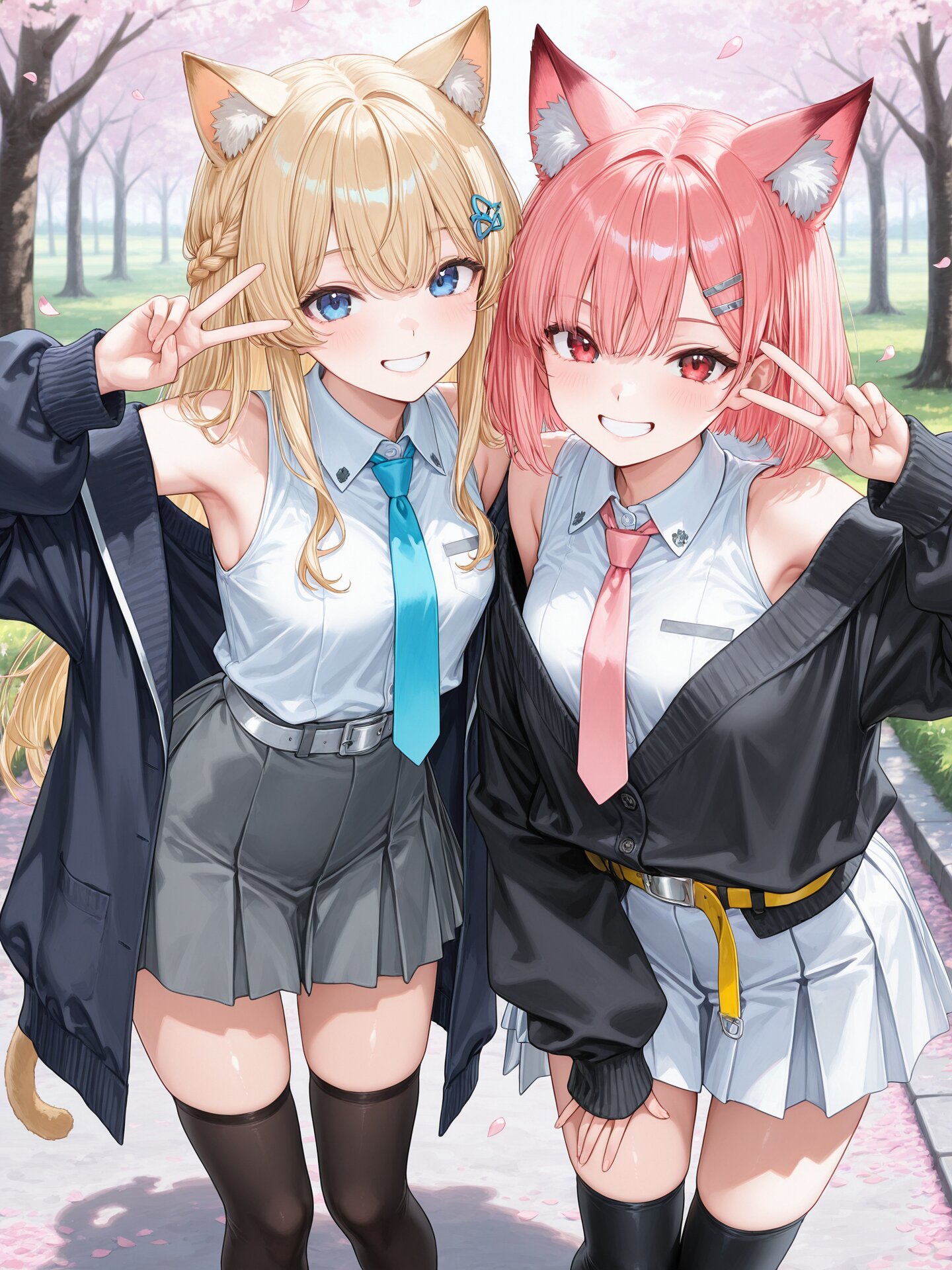 masterpiece, best quality, cowboy shot, detailed a face, depth of field, 2girls, side by side, together, friendly vibe, double peace sign near face, energetic pose, cute pose, bright smile, leaning forward, BREAK (girl A:1.15), left side, blue eyes, long blonde hair, hair between eyes, braid, natural small cat ears, natural cat tail, medium breasts, Oversized dark navy jumper, off shoulder jumper, (white sleeveless buttoned shirt:1.2), (pale blue necktie), silver belt, cool gray pleated skirt, (black thighhigh:1.3), (zettai ryouiki:1.2), BREAK (girl B:1.15), right side, fox ears, (light pink hair:1.2), (short bob hair), air Intake, bangs with hairpin, (deep red eyes:1), medium breast, Oversized black jumper, off shoulder jumper, (white sleeveless buttoned shirt:1.2), (light pink necktie), Yellow belt, white pleated skirt, (black thighhigh:1.3), (zettai ryouiki:1.2), BREAK distinct faces, different hairstyles, balanced composition, BREAK (outdoor), spring scenery, falling Cherry blossom petals,(Intricate:1.7), (delicate:1.3), ((correct_anatomy)), (masterpiece, best quality, perfect anatomy, perfect hands, detailed background, Detailed style, beautiful face, 8K, carefully crafted hair and eyes), shiny skin