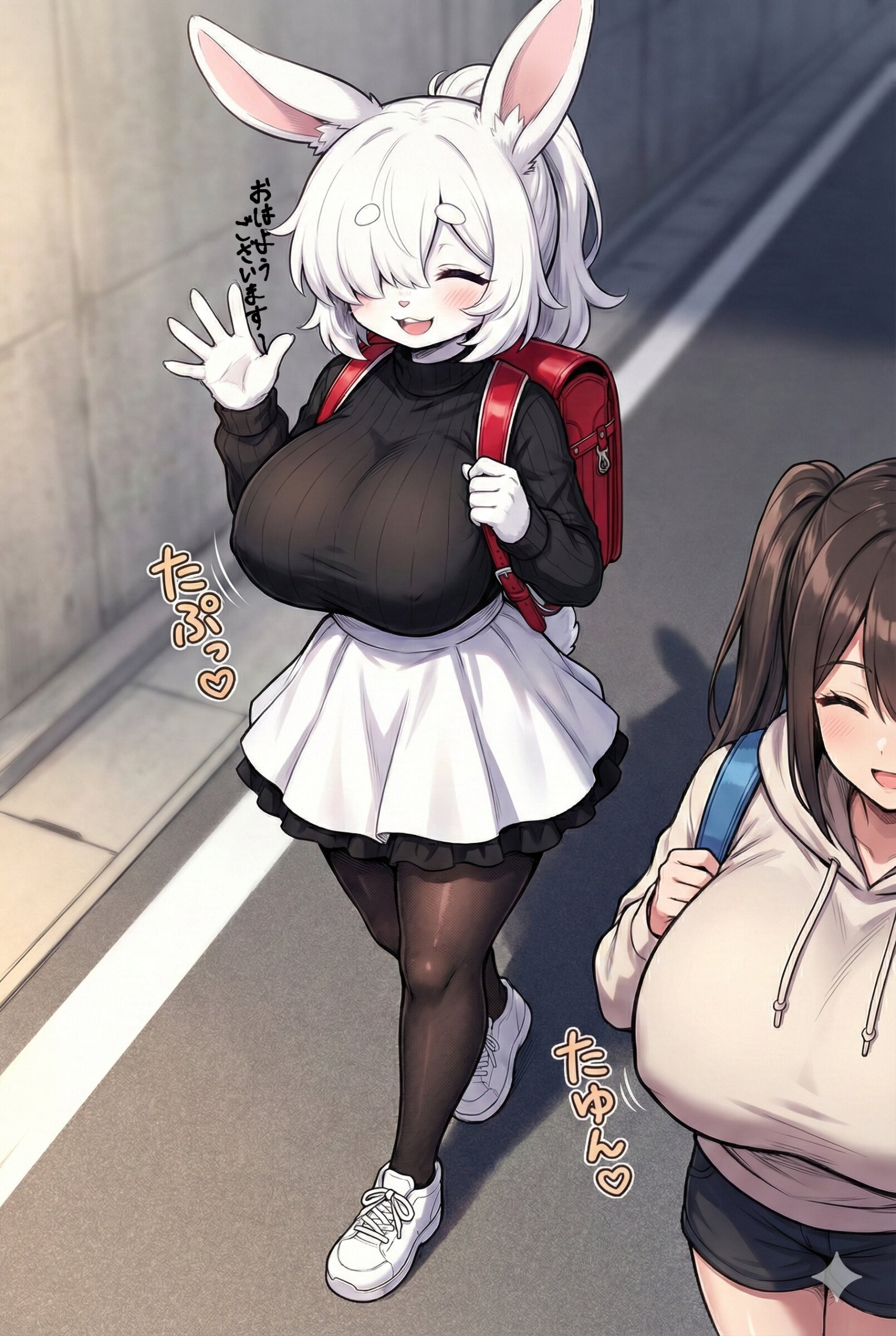 アスペクト比2:3の2Dカラーイラスト。強めの陰影とコントラスト。線は細く薄くする。可愛らしい見た目。小柄。肩幅は狭い。バストは非常に大きく、長くする。ヒップは大きくする。瞳孔は白いハート。[アップロードした画像]の特徴をそのままに、構図とポーズを変更する。背景はぼやけたコンクリートの塀。リボンで結ばれたポニーテール。体毛と衣服と黒いパンティストッキングの質感向上。キャラクターを俯角、ハイポジション、フルフィギュアで写し、真正面から見る。キャラクターにサイド光が差している。キャラクターはランドセルの肩紐を持ちながら、目を閉じて視点を見上げて視点に手を振って挨拶している。胸を上下に揺らす。赤いランドセルを背負っている。顔をズームアップ。手前にキャラクター、奥に道路。衣服は長袖の黒いセーター、白いフレアスカート、黒いペチコート、黒いパンティストッキング、白いスニーカー。セーターの中央部が胸で引っ張られている。隣にパーカーを着て青いランドセルを背負ったバストの非常に大きい女の子と並んで歩いている。遠近感がある。完全に新しいイラスト。