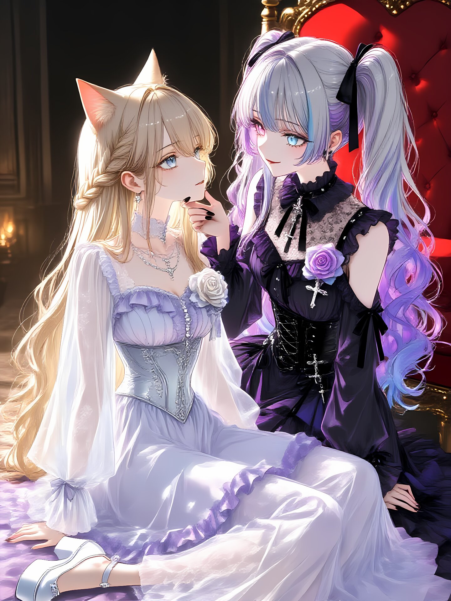 (masterpiece, best quality), anime illustration, ultra-detailed, clean lineart, smooth shading, balanced composition, contrasting aesthetics, intricate lace details, beautiful lighting, 2girls, refined gothic elegance, moonlight-inspired color palette, soft fabric textures, graceful silhouette, intimate close distance, faces close to each other, focused gaze between them, fantasy gothic lolita aesthetic, cowboy shot, BREAK (girl A:1.15), left side, blue eyes, long blonde hair, hair between eyes, braid, natural small cat ears, natural cat tail, medium breasts, quiet sadness, elegant sitting, sitting on floor, sitting beside other girl, looking at another, looking up, softly open mouth, white gothic lolita dress with soft lavender accents, delicate lace and layered frills, lavender ribbons and pearl details, fitted corset bodice with subtle silver embroidery, sheer lace sleeves with frill cuffs, rose corsage with white and pale purple roses, silver cross accessories, lace choker with ribbon, white platform pumps with small buckles, BREAK (girl B:1.15), right side, Silver hair, purple gradation hair, Wavy Long Hair, twintails, heterochromia, purple eye, sky blue eye, long skirt, laced ribbon, black rose and purple rose frill and ribbon and laced ribbon head dress, black nails, black lace and frill and ribbon cuffs, accessories with a cross, corset, rose corsage and platform pumps with buckles, closed mouth, sitting on red throne, gently lifting another girl's chin with her fingers, fingers placed under the chin, mischievous smile, looking down, from side, BREAK soft gothic interior, dim ambient light, faint moonlight, Cinematic Light, Hollywood Lighting, Backlighting, Rim lighting, Soft lighting, Dramatic light, film-style contrast, warm glow, soft shadows,Yuzukastyle, pastel colors,