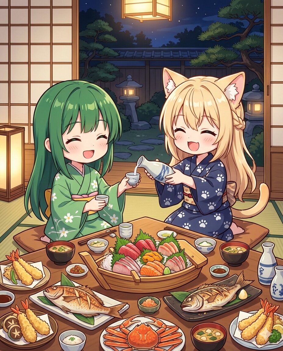緑髪女性の蟒蛇(うわばみ)ちゃんと、金髪猫耳娘ルルのイラスト。 ルルは肉球スタンプ柄の旅館用浴衣を着ている。 夜の旅館の一室での楽しい食事シーン。 蟒蛇ちゃんが持つおちょこにルルがお酌している。 テーブルには海産物を中心に豪勢な和風料理が並んでいる。 アスペクト比4:5で生成して。