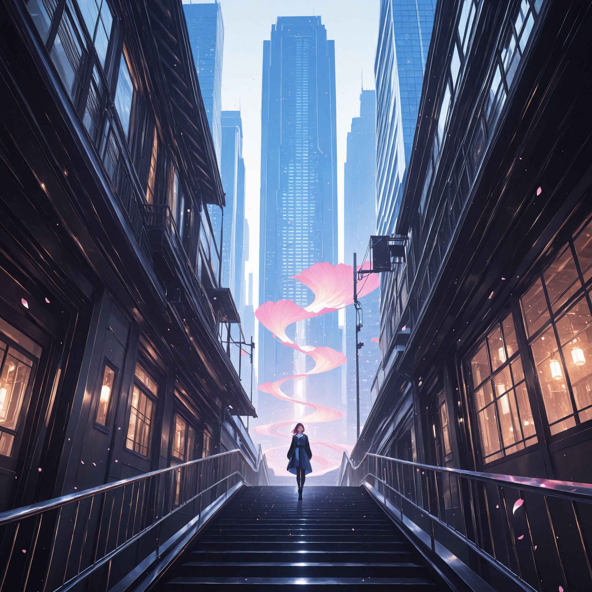masterpiece, best quality, photorealistic, sharp focus, cinematic lighting, depth of field, beautiful composition, vibrant colors, ultra high res, 8K, highly detailed, masterpiece, best quality, very detailed, (masterpiece:1.2), (best quality), (ultra-detailed), 1girl, solo, extreme bird's eye view, looking straight down from the top of a modern skyscraper's spiral staircase, a beautiful woman standing at the very bottom, looking up, geometric leading lines of the architecture, vanishing point, long shadows, glass and steel textures, cinematic high contrast, futuristic city vibes, tiny petals or digital particles falling through the air, masterpiece composition, 8k resolution, dizzying perspective.