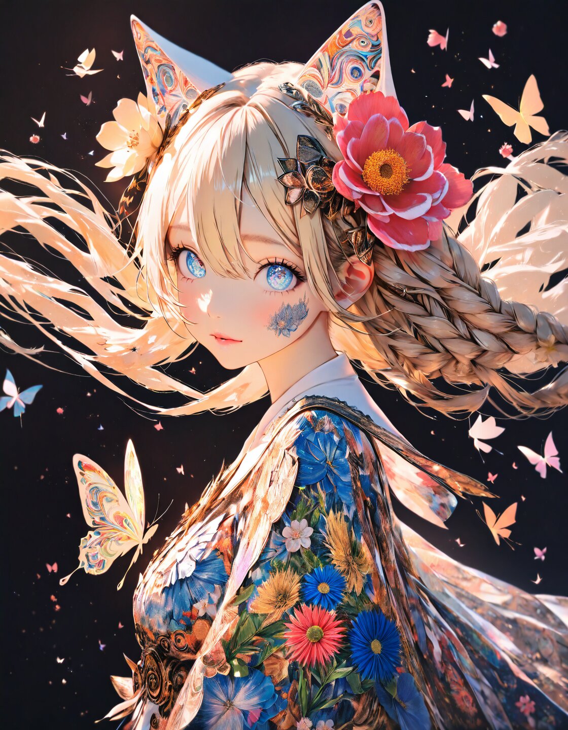 solo,1girl,18 years old,long hair, blonde hair, braid, blonde cat ears, blue eyes, hair between eyes, delicate face, detailed face, detailed skin, fair skin,masterpiece, best quality, insanely detailed, highly detailed, intricate, detailed eyes, beautiful eyes, beautiful face, beautiful hair, beautiful, 16k, photorealistic,hair ornament,beautiful�detailed�flower,beautiful�detailed�eyes,hyper�detailed,flower,hyper�quality,flower�and�hair�is�same�color,beautifuly�color,face,hair�is�becoming�flower,hair,butterfly,kawaii,back�light,hair�and�clothes�is�flower,webbed�dress,flower�leg,flower�hands,body�with�flower,flower�with�clothes,dress�with�flower,light�particles,black�background,Hair�with�flower,breast�with�flower,floating�hair�with�flower,marbling�with�hair�and�clothes,looking�at�viewer,paper�cutting,flower�forground,�diffusion�lighting,abstract,Butterfly�with��body,big�top�sleeves,floating,hazy atmosphere,dreamy atmosphere, art academia, fairy academia, mystical atmosphere, fantasy,side view