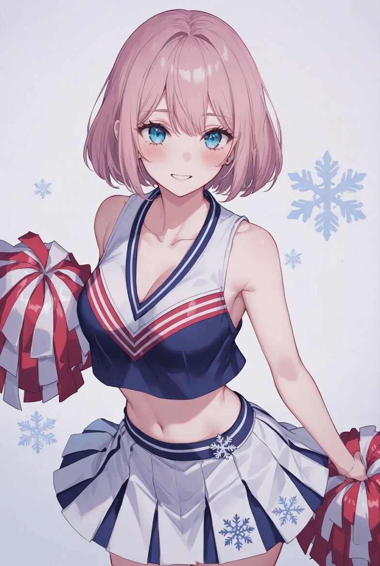 イラスト: 25歳 with short pastel pink bob hair, bangs, large expressive blue eyes, soft smile, fair skin, cheerleader, wearing a uniform with 日本の雪をモチーフにしたユニフォーム, holding pom-poms in both hands.
