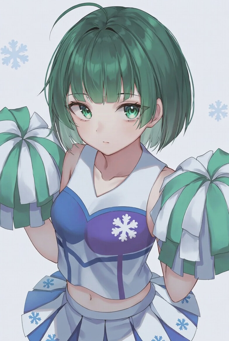 イラスト: 20歳ガール,green hair,light green eyes,blunt bangs,ahoge,short hair,straight hair,hime cut,delicate face,delicate hair,beautifully detailed hair,defined detailed face,beautiful detailed eyes,beautiful detailed eyes,catchlight in eyes., cheerleader, wearing a uniform with 日本の雪をモチーフにしたユニフォーム, holding pom-poms in both hands.