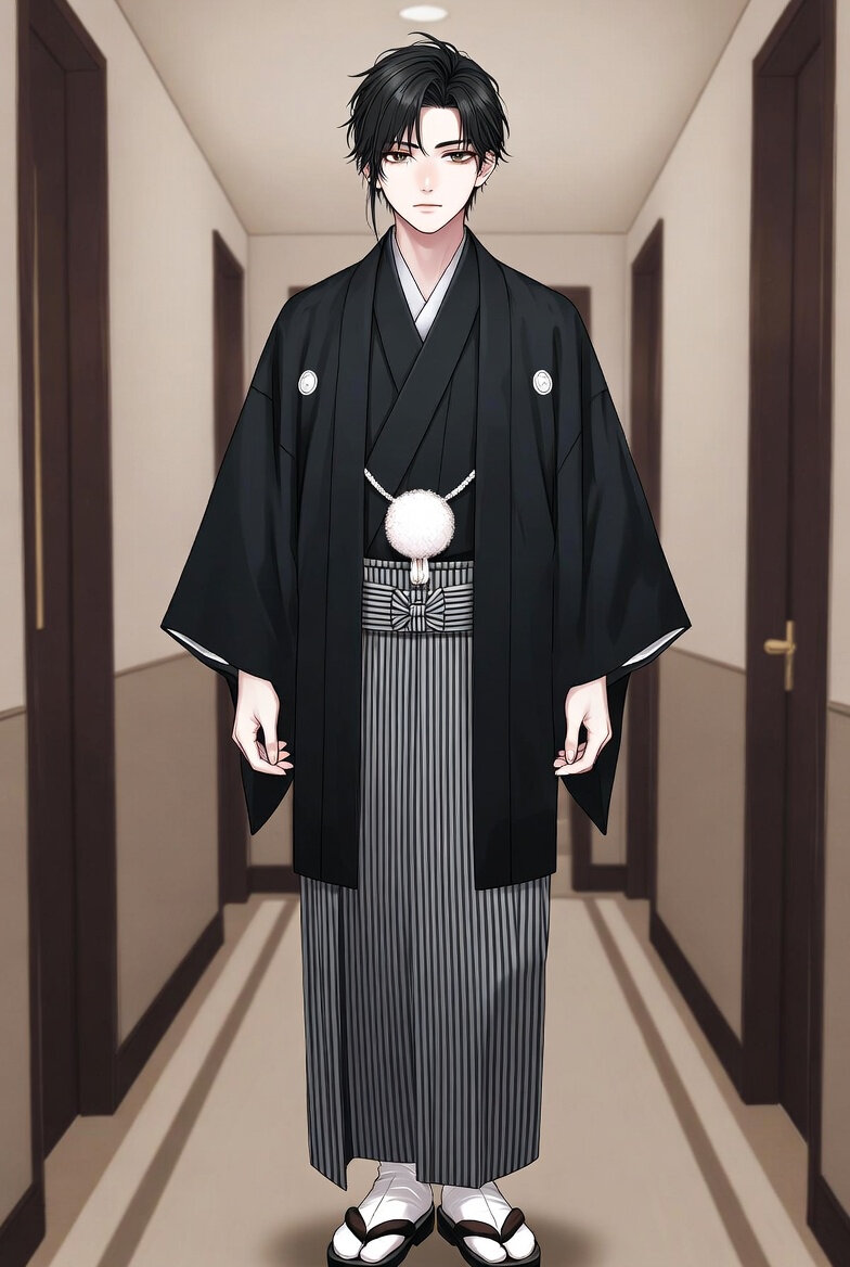 日本の第一礼装、つまり黒羽二重(正絹)の五つ紋付を着た日本人男性のイラスト。 The background is ホテルの通路. 履き物は雪駄と足袋。Full-body shot.カーペットは整っている。 , refined and professional presence for an introduction / business profile image, calm confidence and quiet intelligence, dark, slightly tousled black hair swept back naturally with a few loose strands falling across the forehead, effortless elegance, pale brown eyes with a subtle melancholic glow, gentle yet trustworthy, long eyelashes softly emphasized, refined facial features, elegant and sharp jawline, smooth pale skin, perfectly balanced proportions, clean and sharp line art, polished character design,