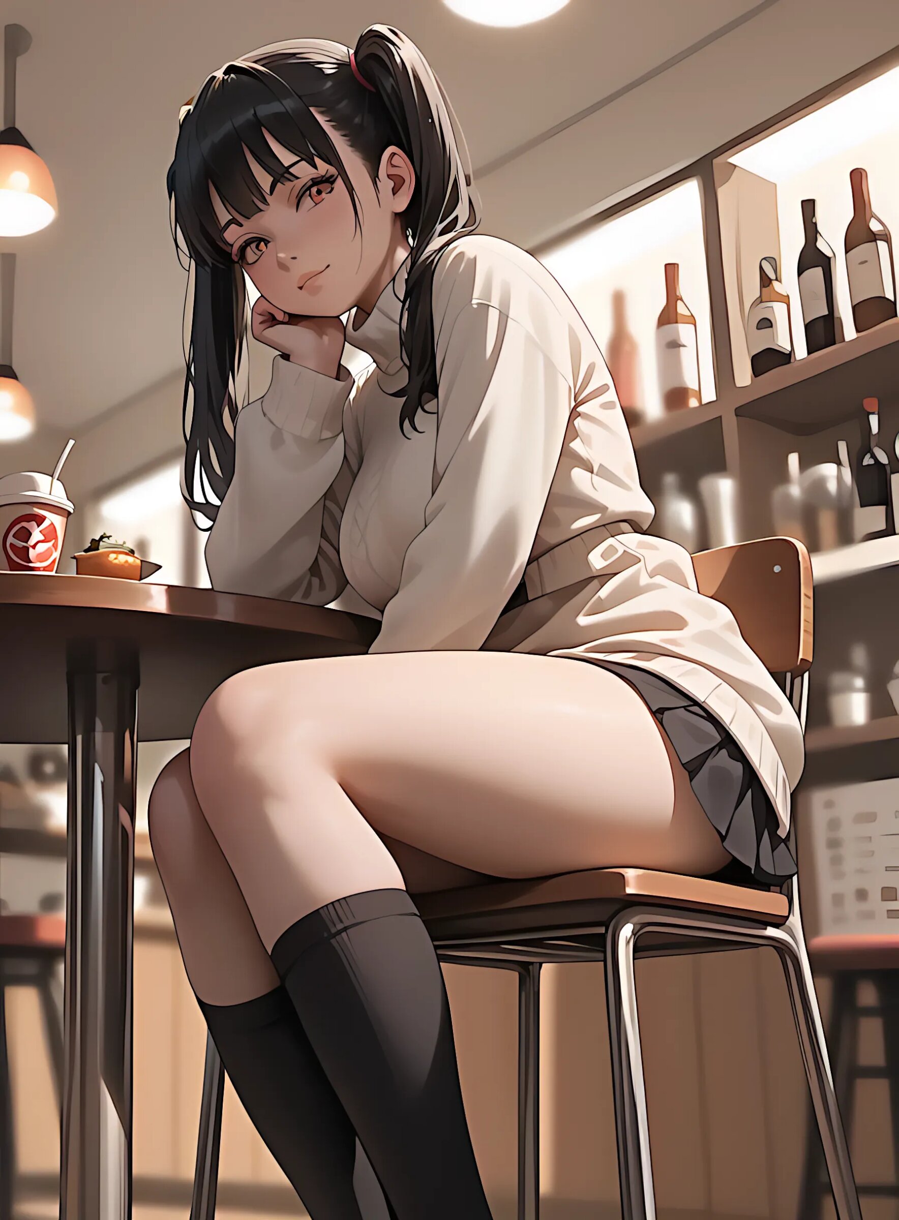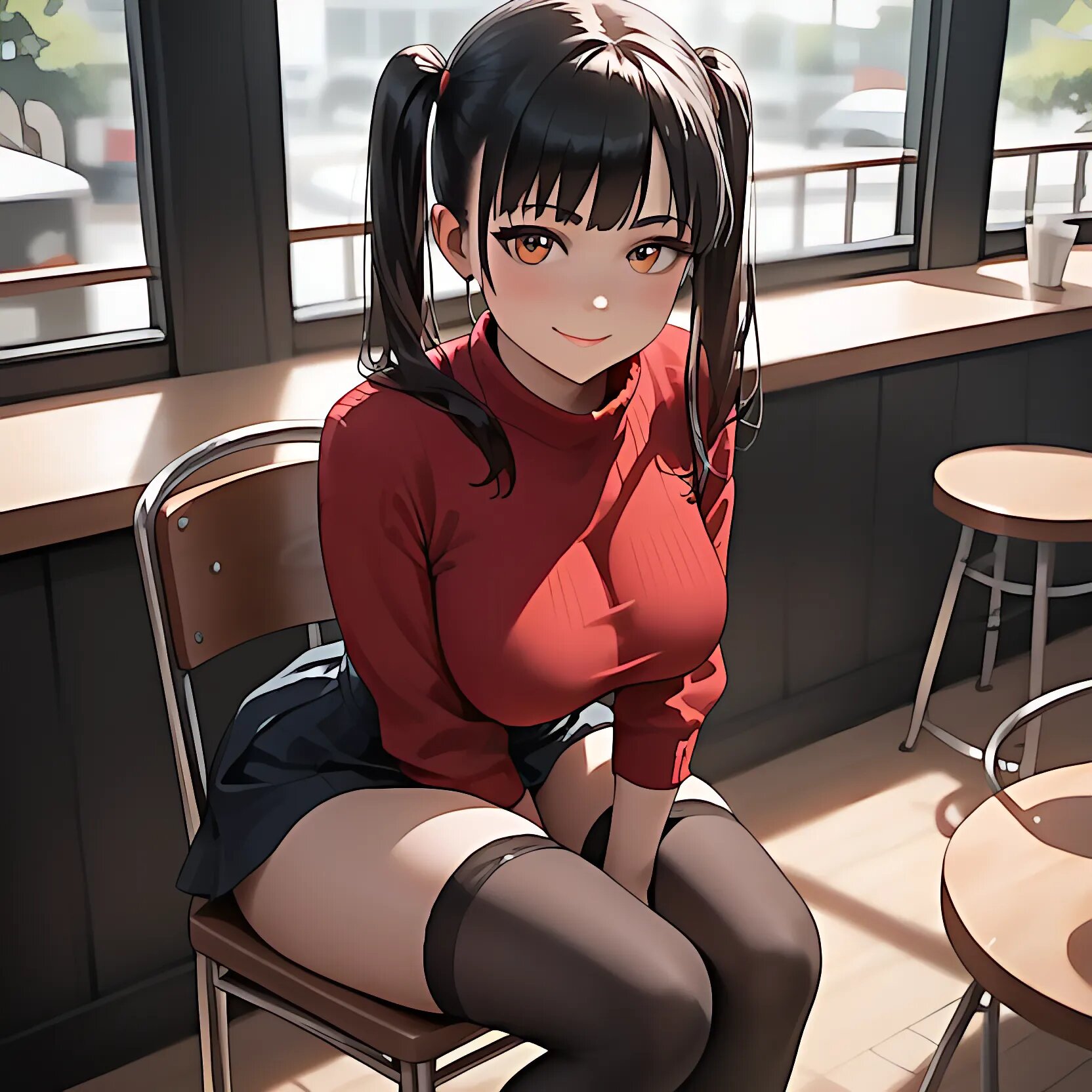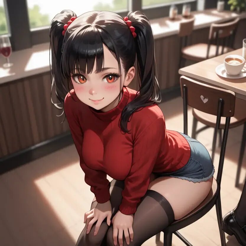 :d,seductive_smile,light_blush,thighhighs_pull,1girl,loli,bishoujo,black hair,twintails,big breasts,narrow_waist,tsurime,early teen,Thigh focus, absolute territory, black over-the-knee socks, black miniskirt, red long-sleeved sweater, girl sitting in a chair, slightly high angle, leaning forward, hand adjusting over-the-knee socks, background is cafe, depth of field, blurred background, warm lighting, realistic, high quality,Increase the resolution