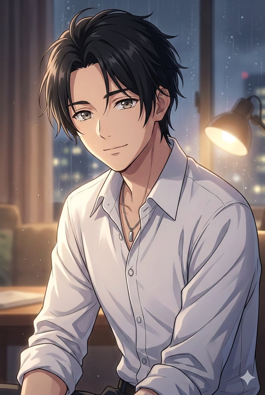 (Masterpiece, Top Quality, High Resolution, 8K Wallpaper: 1.2), Vertical Image, Highly Detailed, Japanese late-night anime television slot from 2015 to 2020, Modern anime-style digital illustration, Breathtakingly handsome teenage to young adult Japanese male, Beautiful boy with a gentle and approachable charm, exuding quiet romance, Dark and slightly messy black hair naturally swept back with a few strands hanging over his forehead, Natural pale brown eyes reflecting the light and giving off a soft, melancholic glow, (Ultra-detailed eyes, Sparkling eyes, Multiple highlights: 1.1), Subtly accentuated long eyelashes, Refined facial features, Elegant jawline, Smooth and pale (soft, lustrous skin), Perfectly balanced anime proportions, Clean and sharp lines giving a refined anime-style finish, Cel-shaded coloring with well-defined shadow edges, Wearing a crisp white dress shirt with slightly rolled-up sleeves, his outfit is simple and neat, the top button is unbuttoned to create a relaxed impression, Friendly, Pendant Soft, diffused light from the lamp, Tyndall effect, subtle bloom, elegant rim light (incandescent: 0.8) highlighting the contours of hair, shoulders and shirt folds, relaxed yet attentive posture, depth of field, rule of thirds, calm and gentle with a slightly shy gaze towards the viewer, cozy interior, city lights seen through the window, glass reflections, soft, blurred background with warm bokeh, transparent, intimate atmosphere, atmosphere of everyday life, calm emotions, ideal visuals for character introductions and gentle narrative illustrations, slightly saturated, warm color palette.