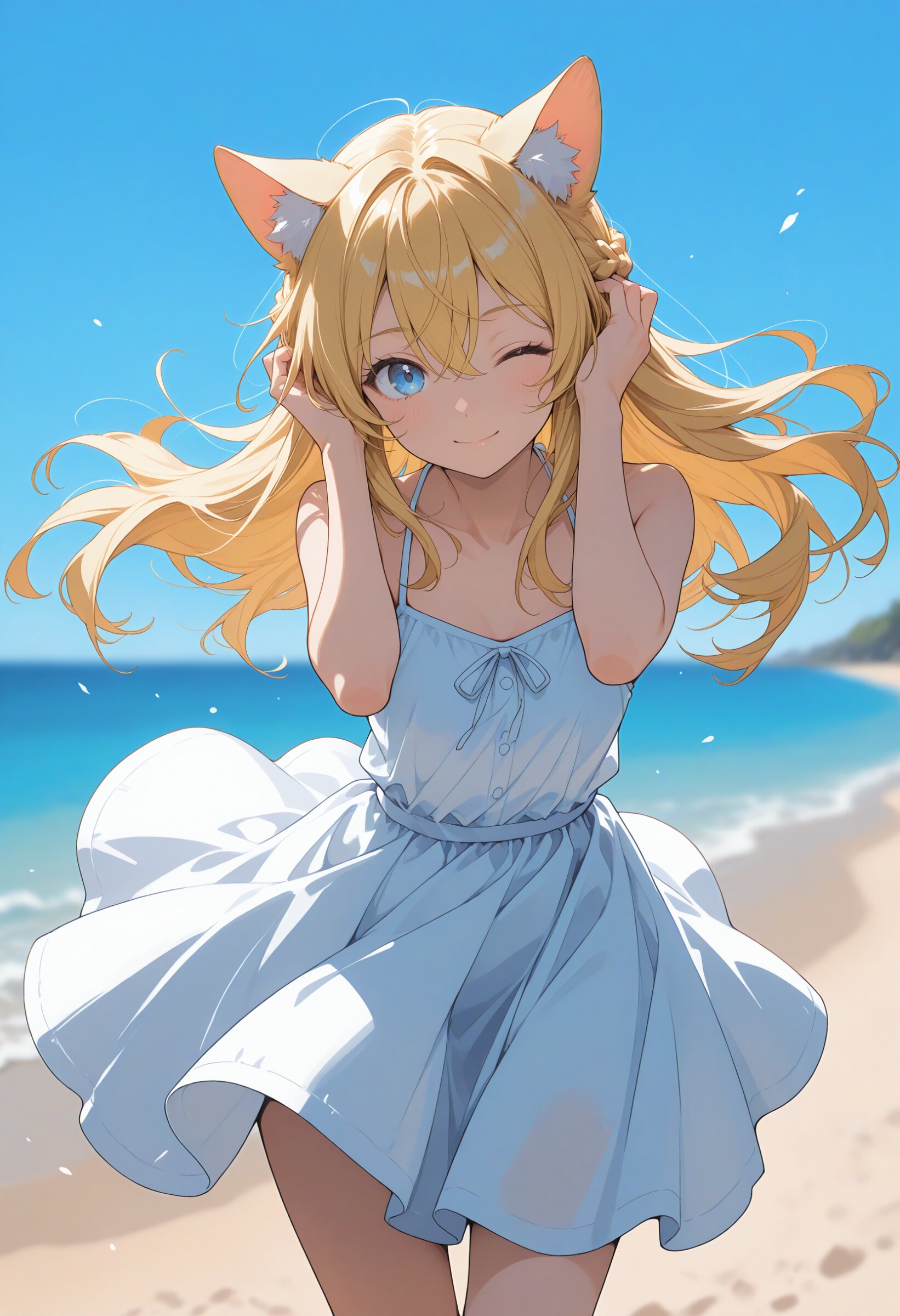 cowboy shot,3/4 view,leaning forward,masterpiece, best quality, amazing quality, very aesthetic, absurdres,watercolor, newest,cute,(flat color:1.5),flat color lineart, colorful, backlighting, beach,blue sky,selective blur, sharp character, slightly blurred background elements,wind, 1girl,long hair, blonde hair, braid, blonde cat ears, blue eyes, hair between eyes,hands on own head, motion blur on background,floating hair, wind,smile,white dress,one eye closed
