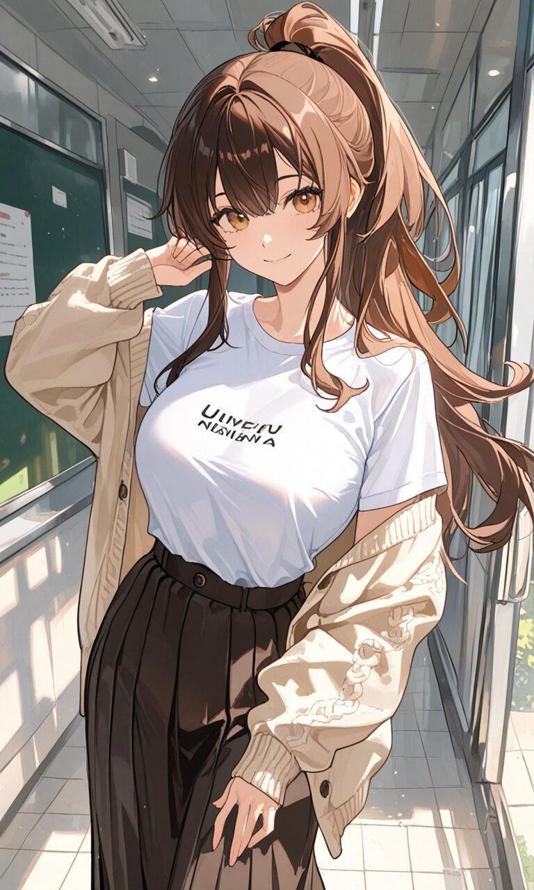 1 lady, long ponytail, brown hair, smile, T shirt, cardigan, long skirt, (university campus) NineV,