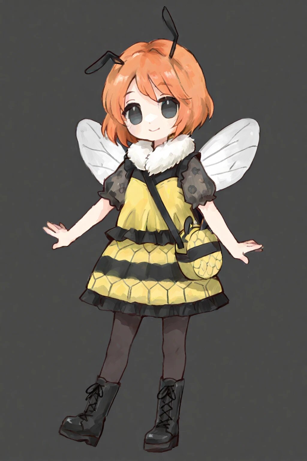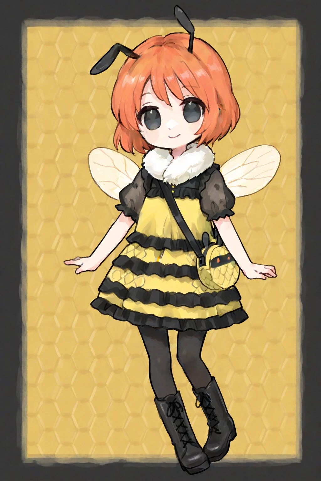 chibi, solo, 1girl, bee antennae, bee wings, white fur around neck, yellow and black horizontal striped dress, short sleeves, see-through lace black sleeves, puffy sleeves, black tights, black lace-up boots, honeycomb patterned bag, skirt decorated with black frills, orange hair, short hair, black eyes, smile ultra-detailed, best quality, masterpiece, very aesthetic, watercolor painting, general, no tail