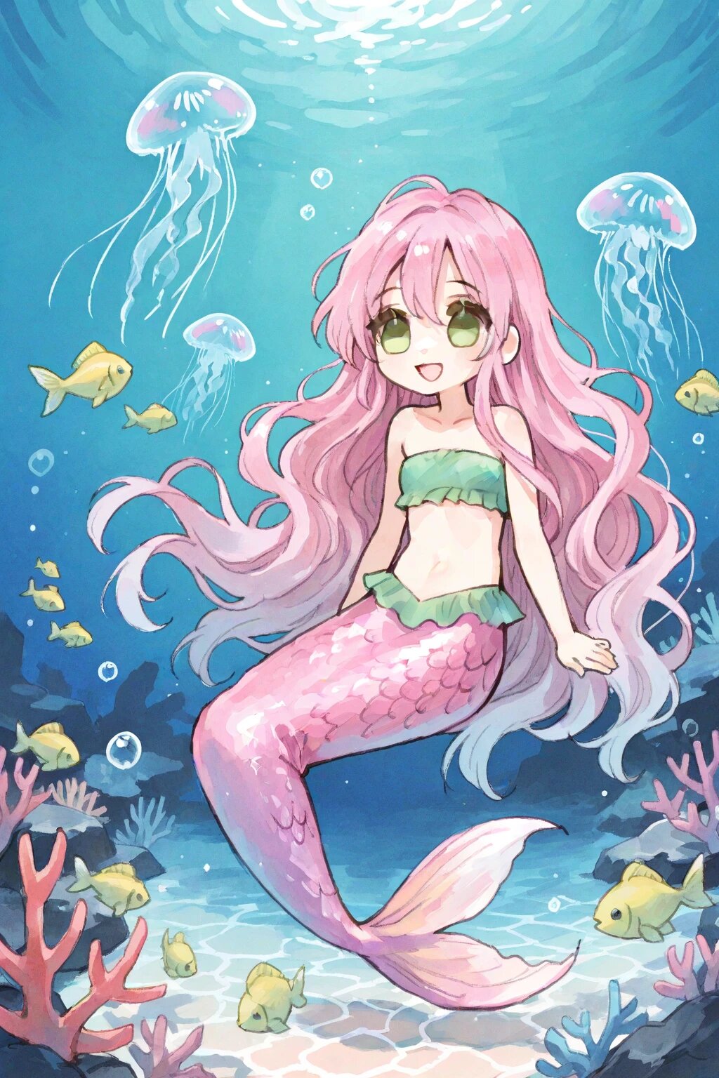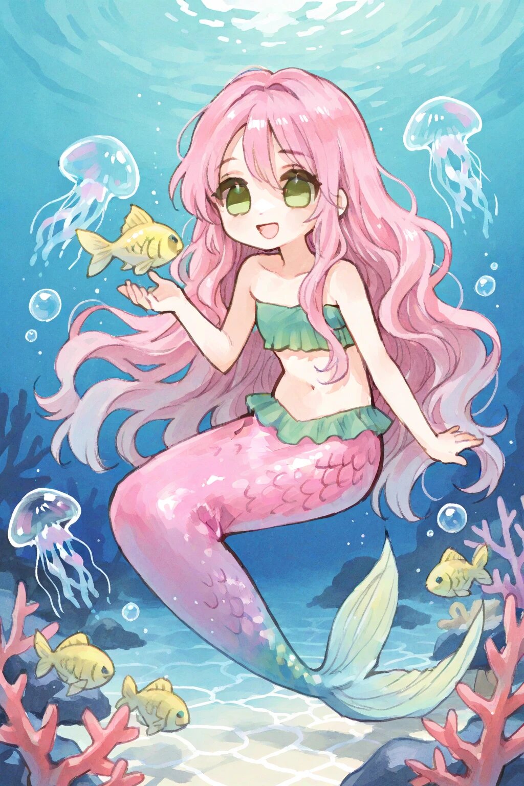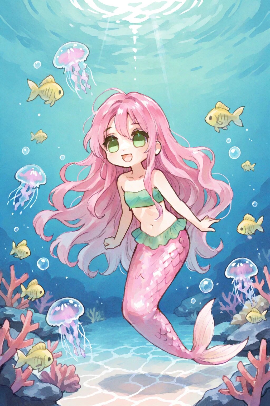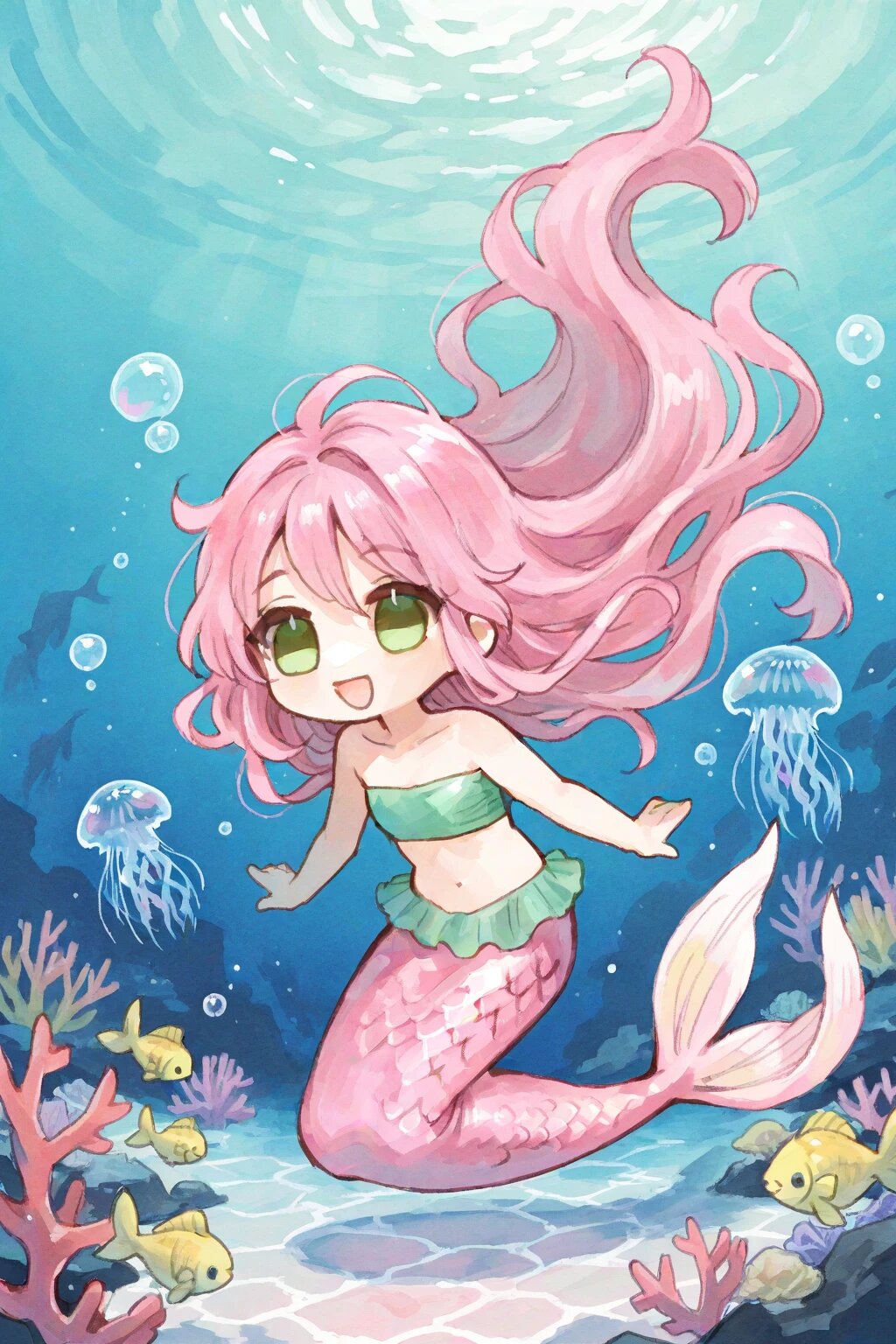 chibi, solo, 1girl, under water, caustics, coral, small yellow fish, bubble, mermaid, pink hair, wavy hair, very long hair, green eyes, green bandeau, pink caudal fin, iridescent caudal fin, jellyfish, smile, open mouth, ultra-detailed, best quality, masterpiece, very aesthetic, watercolor painting, general