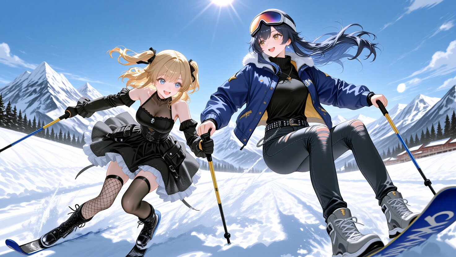 masterpiece, best quality, ultra-detailed, absurdres, two girls enjoying a winter ski trip in a breathtaking alpine resort. Ani, a cheerful girl with medium blonde hair tied in twintails and secured with a black ribbon, has bangs covering her eyebrows and long sidelocks framing her face. Her bright blue eyes sparkle with excitement as she smiles openly. She wears a black gothic dress with lace detailing on the collarbone, bare shoulders, and a short, fluffy layered skirt with white lace trim. Her asymmetrical thighhighs add flair—fishnet on the right leg and solid black on the left—paired with black gloves, layered sleeves, and sturdy black gothic boots. Mika, her companion, sports deep blue hair and warm light brown eyes, dressed in stylish casual streetwear. Her (deep blue jacket:1.2) features gold star accents on the sleeves and collar, layered over a black turtleneck. A black studded belt cinches her waist, while her ripped black jeans—torn at the right knee and left thigh—add an edgy touch, completed by grey sneakers. Both girls energetically (go skiing:1.1), gripping ski poles as they carve through fresh powder snow, kicking up a dynamic spray of snow with motion blur enhancing their speed. The backdrop features towering snowy alpine mountains under a crisp blue sky, with the winter sun casting a golden glow over the resort. The scene radiates winter sports energy, with highly detailed snow textures and a vibrant, lively atmosphere.