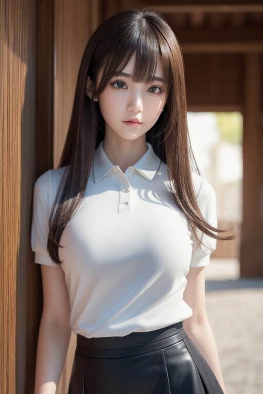 masterpiece, hyper detailed, 8K, hyper detailed illustration, Japanese woman, 23yo, (cute:1.1), (pretty:1.1), hyper detailed face, hyper detailed eye, beautiful eye, medium hair,(bangs:1.1), thin, tall,170cm tall, polo shirt, short skirt, kneehighs, hyper detailed, extremely detailed,