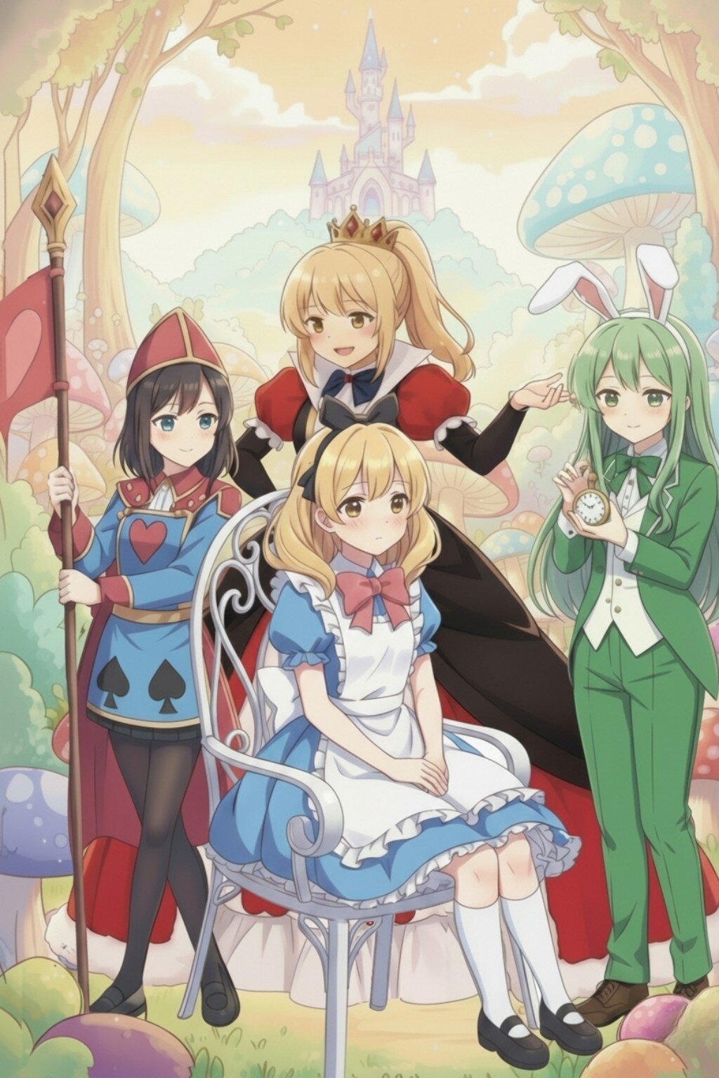 Full shot, fantasy, Alice in Wonderland, cute anime girls, Alice with blonde hair and blue dress, Queen of Hearts with blonde hair and red dress, Card soldier with dark hair and blue suit, White Rabbit with green hair and green suit, magical forest, giant mushrooms, castle in the background, soft lighting, vibrant colors, detailed, high quality, anime style, clean lines