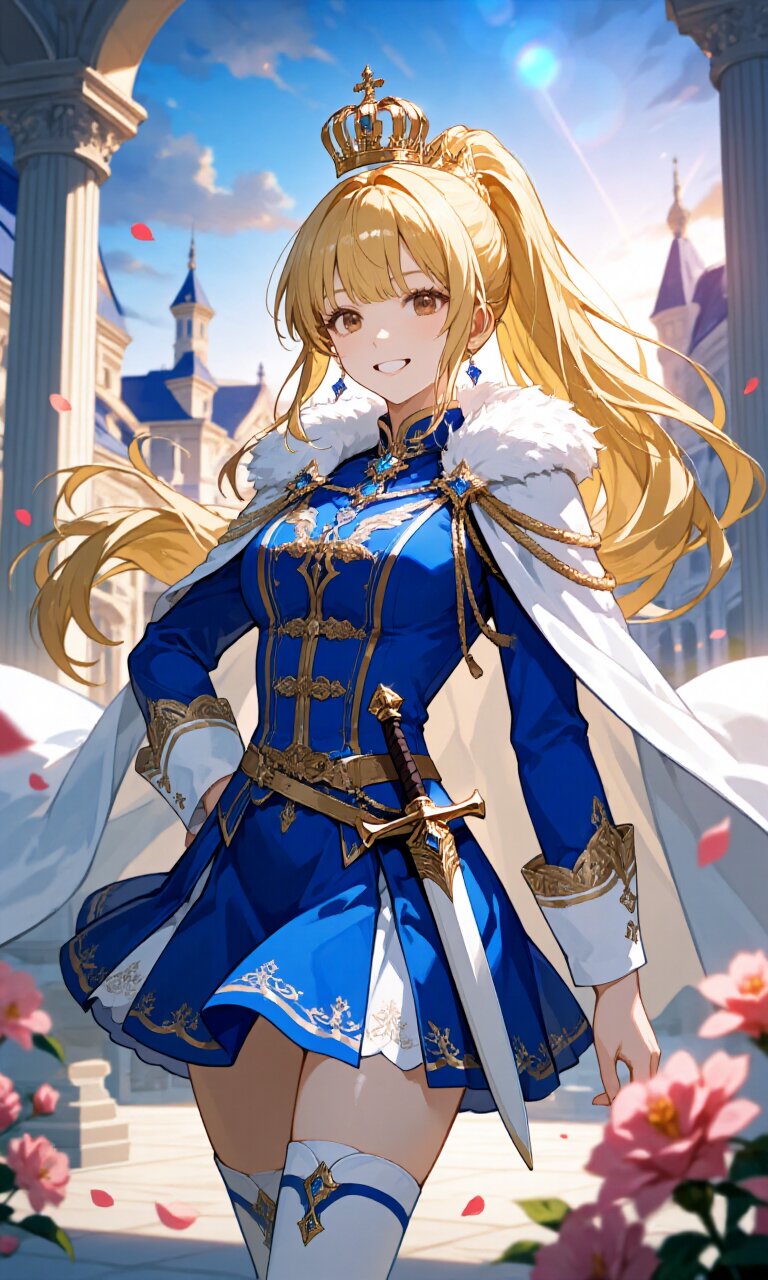 A stunningly beautiful young woman with long, flowing blonde hair tied in a high ponytail stands proudly in a grand palace courtyard at dawn during the blue hour. She has delicate facial features with expressive brown eyes, fair flawless skin, and wears a cheerful yet proud grin. Her (Blue luxurious Prince costume with gold embroidery:1.6) features intricate detailing with long sleeves, paired with a (luxurious Blue mini skirt:1.4) and (luxurious White thighhighs:1.3). A (luxurious White Cape:1.3) billows dramatically behind her, while a (Dagger on waist:1.3) glints at her hip. Atop her head rests a (luxurious crown on head:1.4), completing her royal ensemble. The postmodern architecture of the palace features romantic academia elements with towering columns and ornate details. The scene is bathed in soft lighting with lens flare effects, surrounded by blooming flowers that add vibrant color. The atmosphere is magical and regal, with petals floating through the air. The artwork is insanely detailed, from the delicate strands of her hair to the intricate embroidery on her clothes, creating a masterpiece-quality illustration with a 16k level of refinement.