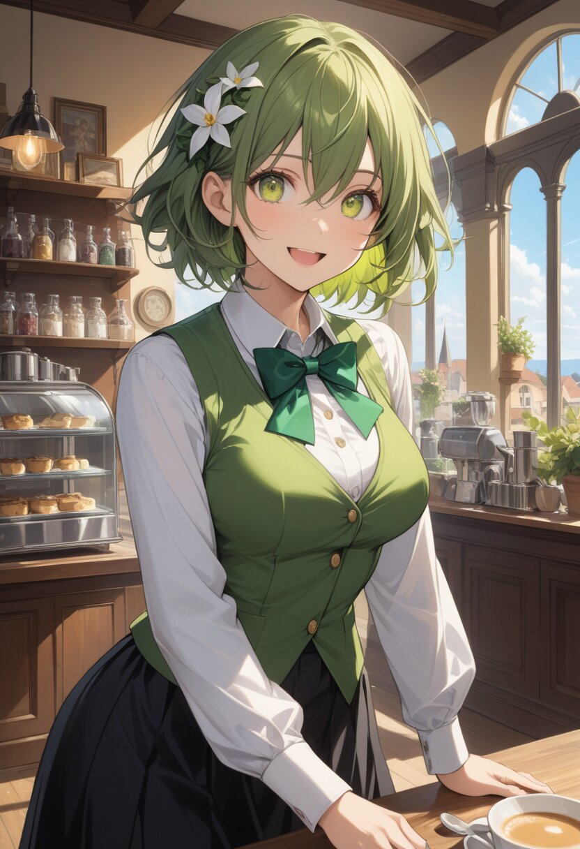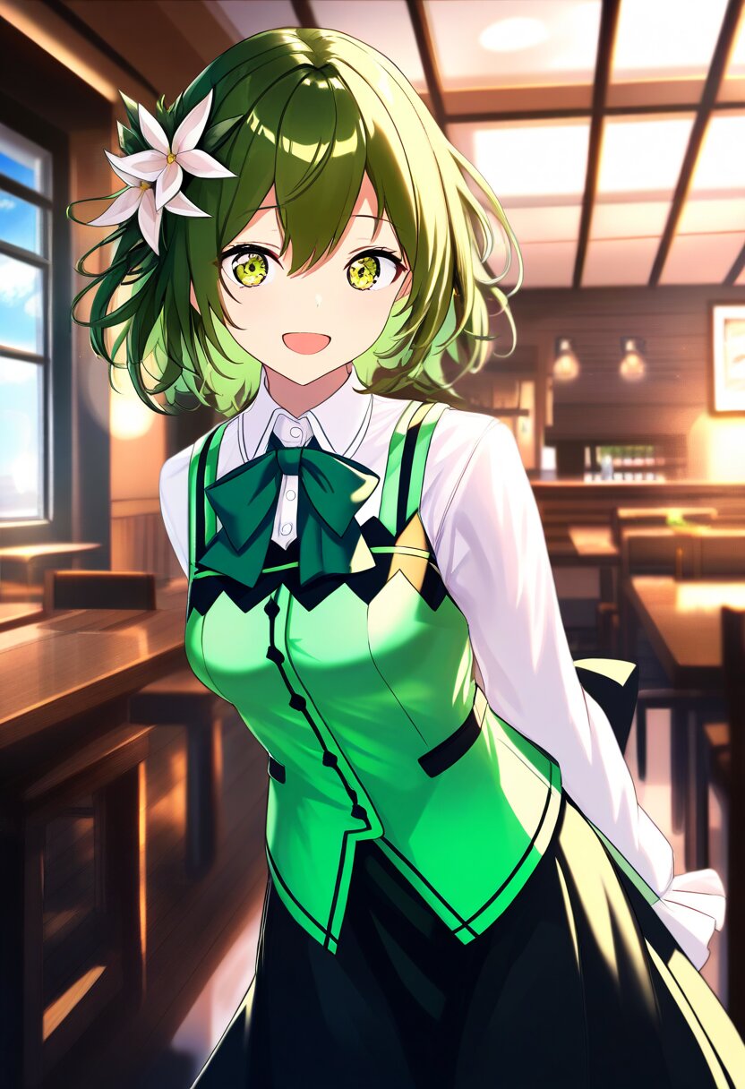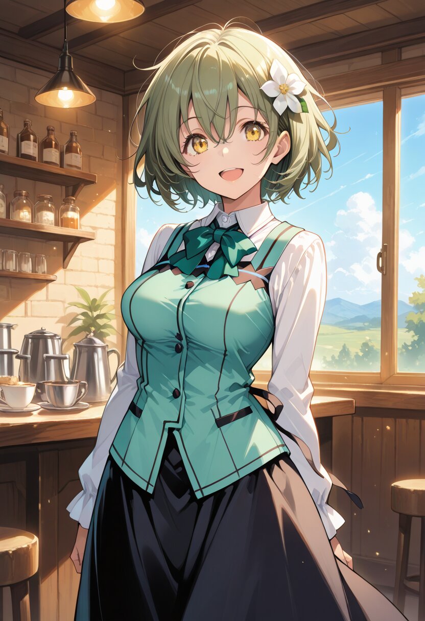 masterpiece,best quality,amazing quality,general, fine detail, official art, 1girl, cute face, messy hair, medium-short hair, olive-green hair, large expressive yellow-green eyes, hair between eyes, (finely detailed beautiful eyes: 1.2), (medium breasts, beatiful breasts), (Beautiful and detailed face), beautiful, 1 girl, solo, hair flower, hair ornament, smile, open mouth, :d, collared shirt, shirt, white shirt, green vest, green bow, bow, vest, long sleeves, green bowtie, bowtie, wing collar, buttons, black skirt, long skirt, rabbit house uniform, standing, looking at viewer, cowboy shot, sky, day, indoors, cafe, (intricate:1.1), masterpiece, best quality, highest quality, highly detailed face, ray tracing, vibrant colors, depth of field, cinematic lighting, sharp focus, action shot, (Extremely Detailed 16K CG)