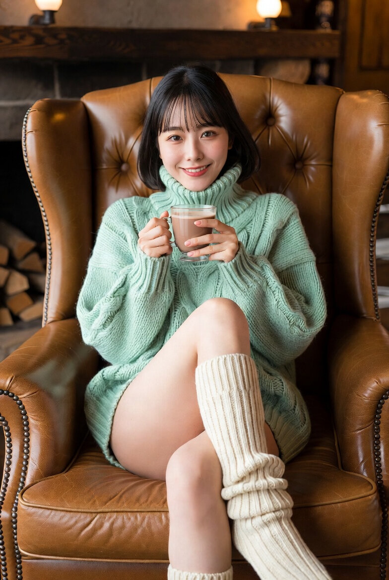 日本人女性20歳の写真。 "styling_and_apparel": top: "Chunky cable-knit turtleneck sweater, oversized fit, mint green / pistachio color", bottoms: "Matching mint green knit shorts (barely visible)", legwear: "Cream-colored ribbed knit leg warmers, slouched styling", aesthetic: "Cozy chic, winter loungewear, trendy influencer style" "pose_and_action": posture: "Seated comfortably in a large armchair, one leg bent upward, relaxed body language", interaction: "Holding a clear glass mug containing a hot chocolate drink with both hands near chin level", gaze: "Direct eye contact with camera, soft inviting smile" "environment": { location: "Rustic interior, likely a ski lodge corner", furniture: "Vintage brown tufted leather wingback chair", background_elements:暖炉、薪、クラシックな照明器具。
