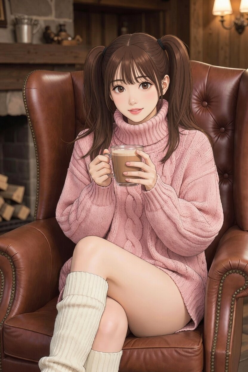 anime styleデジタルイラスト: 日本人女性20歳。 "styling_and_apparel": top: "Chunky cable-knit turtleneck sweater, oversized fit, light pink", bottoms: "Matching light pink knit shorts (barely visible)", legwear: "Cream-colored ribbed knit leg warmers, slouched styling", aesthetic: "Cozy chic, winter loungewear, trendy influencer style" "pose_and_action": posture: "Seated comfortably in a large armchair, one leg bent upward, relaxed body language", interaction: "Holding a clear glass mug containing a hot chocolate drink with both hands near chin level", gaze: "Direct eye contact with camera, soft inviting smile" "environment": { location: "Rustic interior, likely a ski lodge corner", furniture: "Vintage brown tufted leather wingback chair", background_elements:暖炉、薪、クラシックな照明器具。
