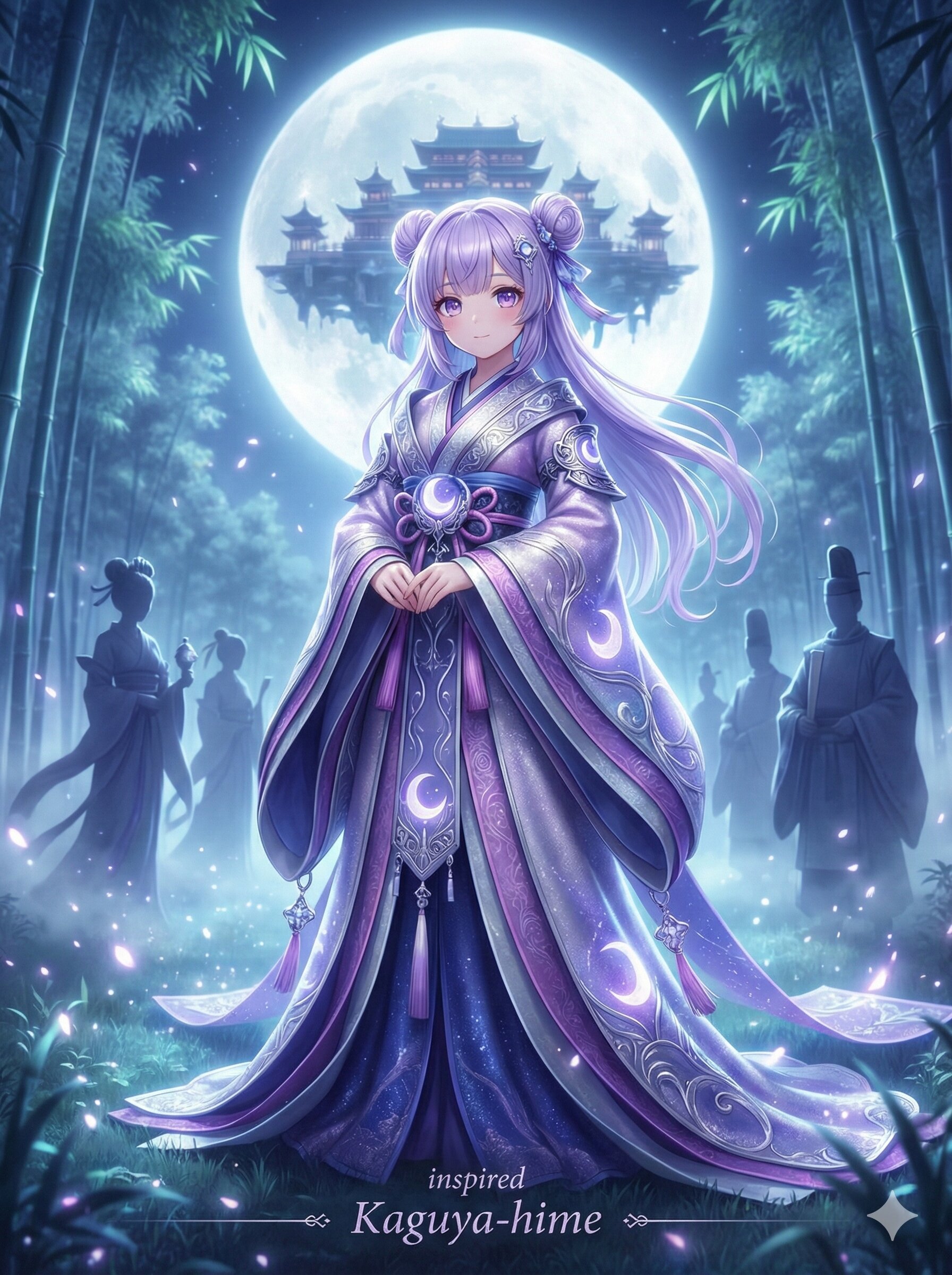 * カラーパレット: 元のキャラクターの特徴である美しい「ラベンダー色の髪」と「紫の瞳」は、夜空や月光を連想させます。ここから、月からの使者であるかぐや姫が最も親和性が高いと判断しました。