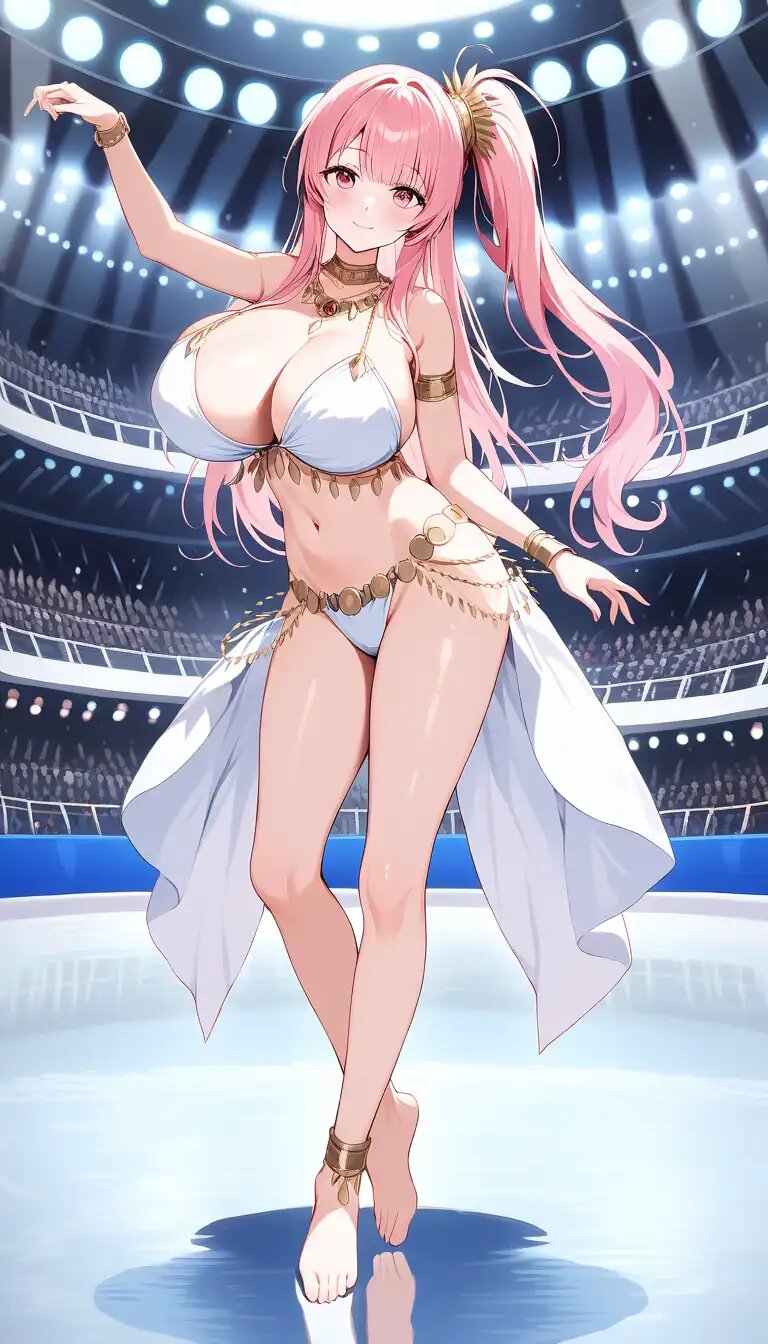 [masterpiece]++, [best quality]++, [ultra detailed]++, [8K]++, [dancer]++, [harem outfit]++, [Dancing]++, [full body]++,[huge breasts]++, perky breasts, hanging breasts, curvy, collarbone, cleavage, gold necklace, bare shoulders, bare arms, gold bracelet, midriff, bare legs, [barefoot]++, [tall]++, [long hair]++, [straight hair]++, [shiny skin]++, [shiny clothes]++, smile, blush, closed mouth, [Figure skating rink]++, [audience]++, indoors, [Ice Floor]++, light, [high side ponytail]++,