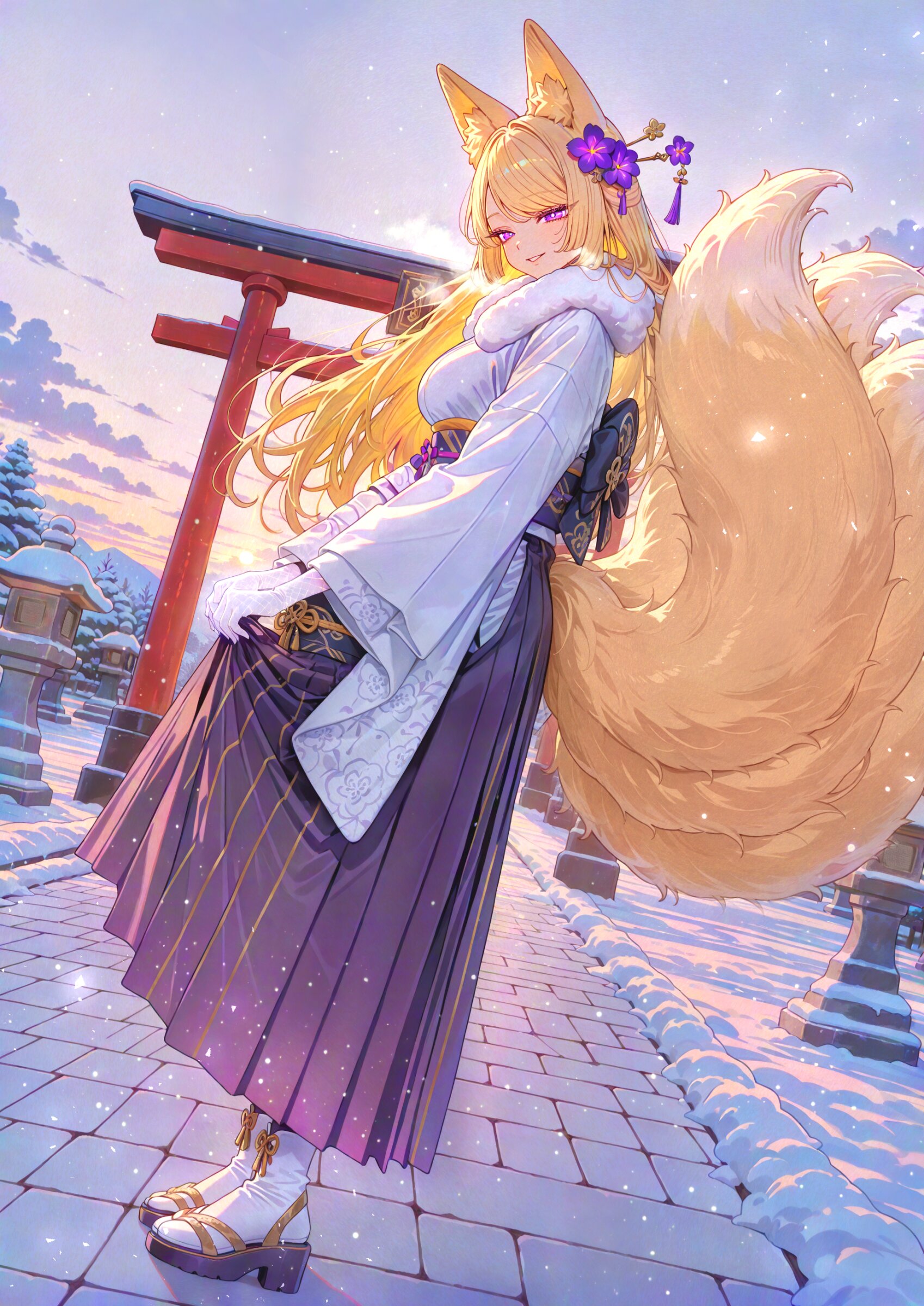 from side, looking at viewer, High Horizon, (portrait:1.2), dynamic angle, looking at viewer, (simple pastel color background:1.1), drop shadow, colored shadow, cloudy sky morning light, The background is a solid, bright warm colored copper, creating a striking contrast with the intricate, multi-colored design of the character, (ink wash effect:0.9), pop color background, (high saturation:1.2), winter coloring, winter atmosphere, divine atmosphere, sacred aura, morning torii, shrine, stone floor, stone lantern, komainu, snow, 1girl, fox girl, gold Blond Hair, large breasts and fox ears, (swept bangs:1.2), (perfect purple eyes:1.3) long eyelashes aristocratic features tall girl has (Blond Hair long hair over ears:1.3) fox 9tails, (wearing White Japanese Cloth straw sandal precise silk gloves long skirt Obi boots:1.3), hair ornament flower, tabi, long sleeves, winter scarf, (fur trim:1.1), black thighhighs, mysterious atmosphere, seductive smile, doyagao, hands on own knees, new year theme, super fine concept art, unreal engine, graceful eyes, masterpiece, best quality, amazing quality, very aesthetic, absurdres, newest, professional art lots of details, , overexposure, sumie effect style, 4ur4_illu,shiny, glowing, glowing particles, glowing light particles, light particles, invisible force lines, <lora:noline (1):-0.5> <lora:sdxl2-flat2-512b:0.0> <lora:facelightup_xl_v10:0.5> <lora:V2_yakumo_alchemy:0.5> <lora:Aura_illu:0.1>