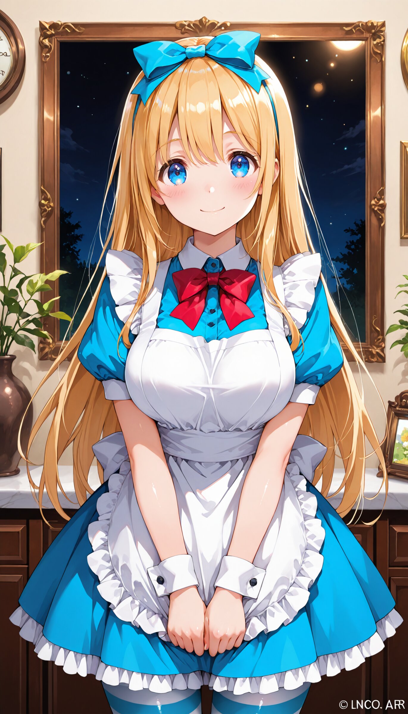 (masterpiece,high resolusion,illustration,ultra detailed 8k art,extremely detailed CG,official art,clothes reflecting light,detailed shiny skin,detailed background:1.3), ((highly detailed beautiful face and eyes)) BREAK 1girl, upper_body, 16-year-old, kawaii, cute_face, tareme, inocent_smile, no_makeup, beautiful_anime_girl, blonde_hair, long_hair, straight_hair, large_breasts, beautiful_breasts, blue dress, bow, dress, frilled apron, frilled dress, short sleeves, puffy sleeves, striped pantyhose, white apron, white bloomers, wrist cuffs,kawaii, Alice in wonderland,