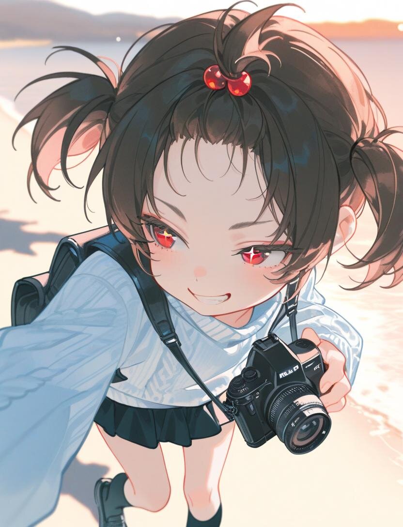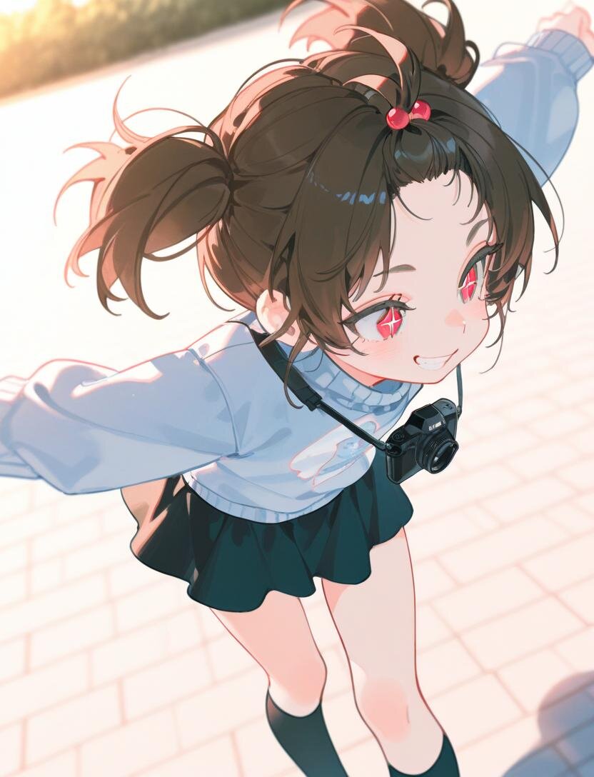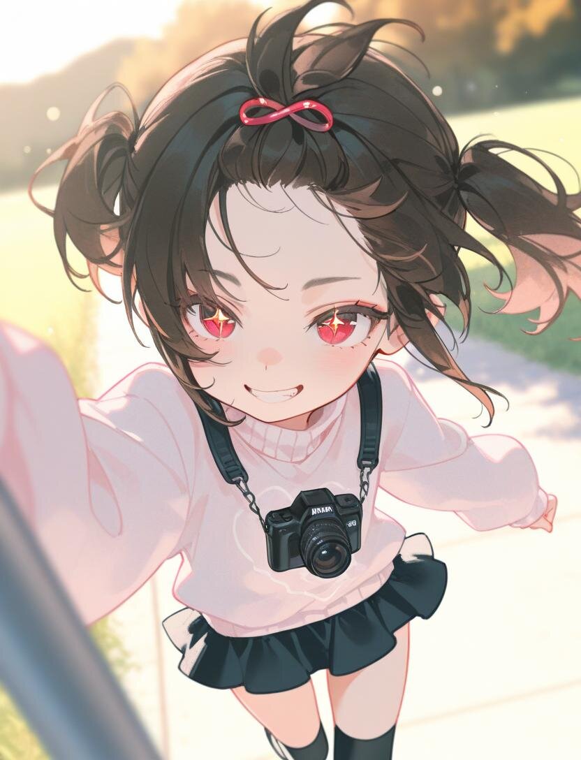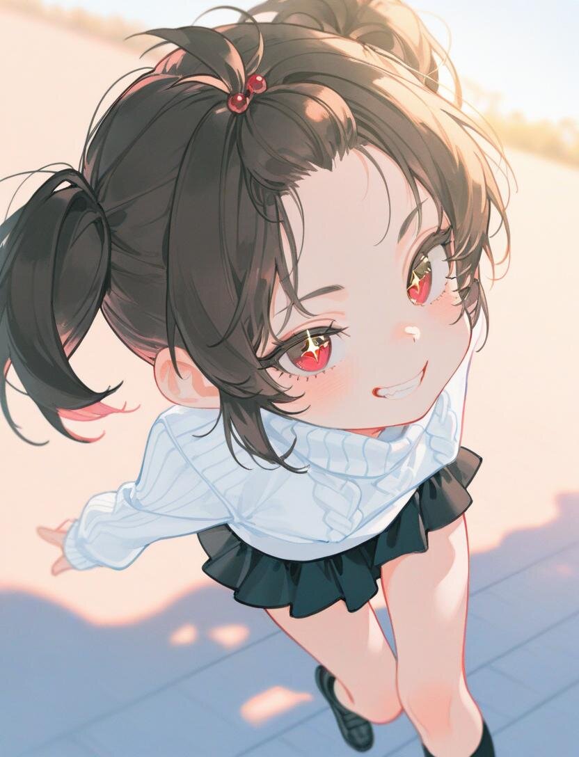 high twintails、best quality, masterpiece, photorealistic, realistic, ultra high definition, ray tracung、1girl、solo、(((loli0.5)))、 blurry background、dark brown hair、short hair、ahoge、evil grin、Red eyes、bangs pinned back、slant eyes、sparkling pupils、cherry pink lip、outdoors riverside, a girl running freely along the riverbank, lively natural movement, camera-facing gaze, slight high angle, strong face focus, refreshing smile, light blue long-sleeve sweater, black mini skirt, black knee-high socks, clear contrast between skirt and socks, skirt and hair gently fluttering, warm evening sunlight, clear sky, golden hour lighting, realistic style, strong depth of field, shallow focus, creamy background bokeh, subject sharply in focus, background heavily blurred, soft shadows, calm and fresh atmosphere