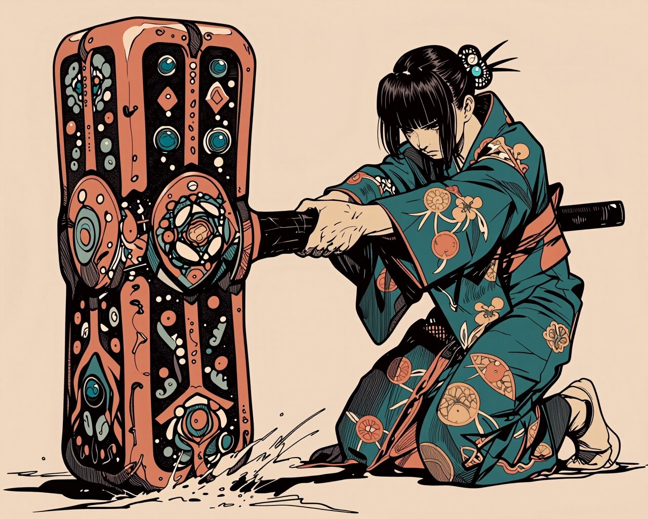 A woman in a kimono is about to strike the ground with a giant hammer. The giant hammer is adorned with beautiful jewels. The camera is positioned low in front of her, filming her from below.