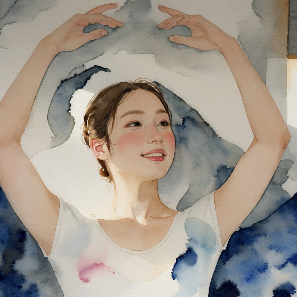 best quality, masterpiece, (watercolor painting:1.4), (line art:1.0), (illustration:1.2), (cel anime:1.1) Portrait, dramatic lighting, natural shadow, light on face:1.2, depth of field, school, Backlit:1.2, japanese, 1 cute girl, (small breasts:1.4), eyes detail, (happy smile:0.5), ballerina cosplay, dancing, black leotard, standing,