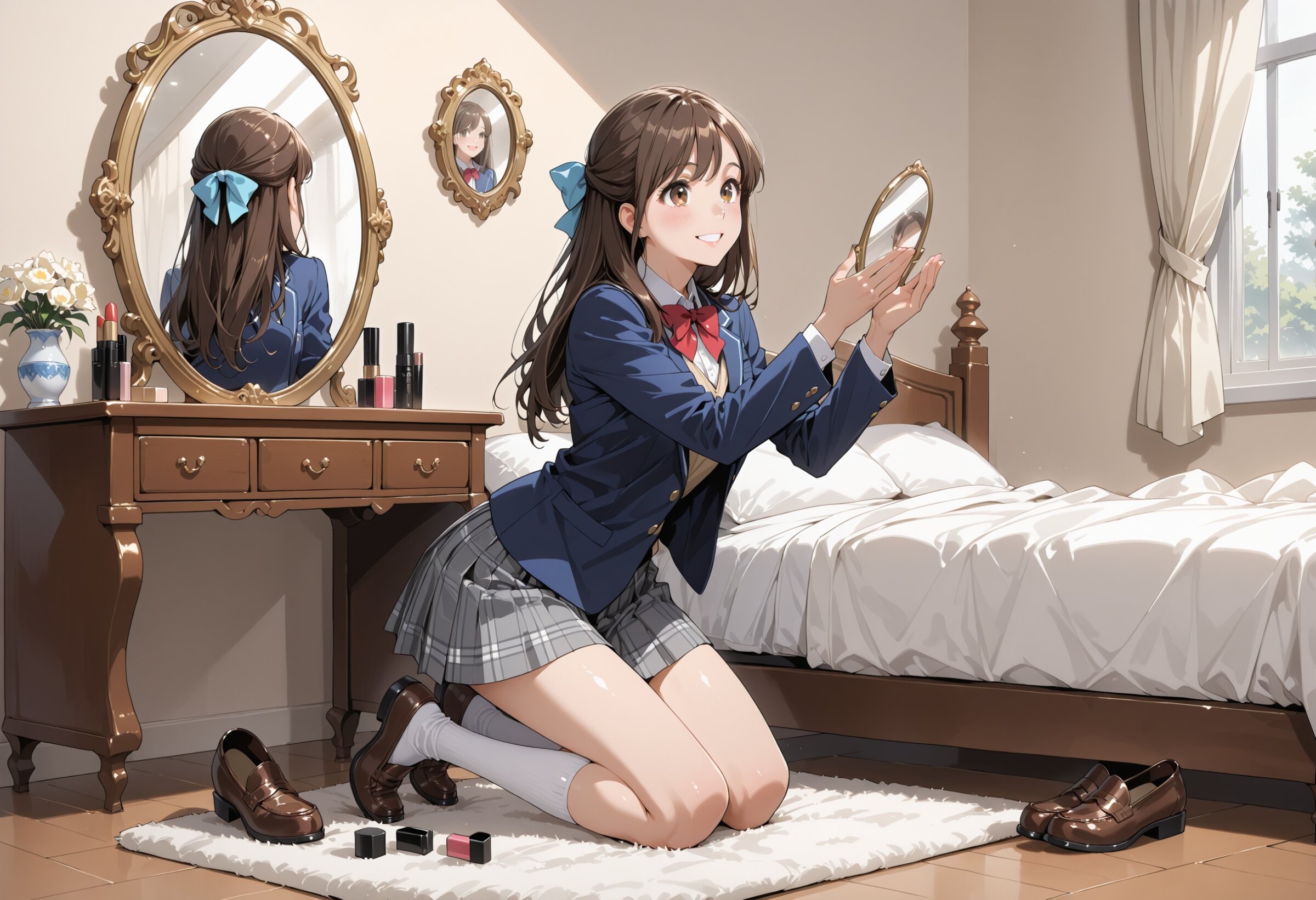 High resolution, Super detailed, Best Quality, masterpiece, 8K, 4K, beautiful background, the best aesthetics, BREAK 1girl, 17yo,long hair, brown hair, brown eyes,half up, school uniform, hair bow,happy smile,full body, white socks,blue blazer,full clothes,kneeling wear loafers on bed,fall on her hands, BREAK bedroom,reflection shining mirror of a dressing table, arrange of cosmetics,