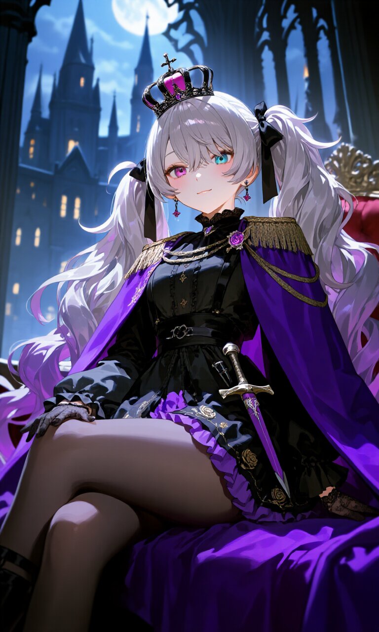 A stunningly detailed illustration of a young woman with a delicate, cute face featuring heterochromia - one purple eye and one sky blue eye. Her long, wavy silver hair cascades down with purple gradation, styled in elegant twintails tied with black laced ribbons. She wears a (Black luxurious prince costume with rose embroidery:1.4) paired with a (Purple luxurious cape:1.2) that drapes dramatically behind her. The outfit includes a (luxurious Black mini skirt with Purple frills:1.4), long sleeves, and (luxurious Black lace gloves:1.2). A (dagger on waist:1.3) and (luxurious crown on head:1.2) complete her princely attire. She sits gracefully (sitting on luxurious chair:1.5) in a Gothic palace, her posture regal yet relaxed with a light smile. The background features intricate Gothic architecture illuminated by moonlight, creating a romantic, gothic atmosphere with soft lighting and bloom effects. The scene is set at midnight, with a hazy, mysterious academia mood. The artwork is photorealistic with 16K quality, showcasing outstanding intricacies in every detail from her (luxurious Brack tights:1.3) to the delicate embroidery on her costume.