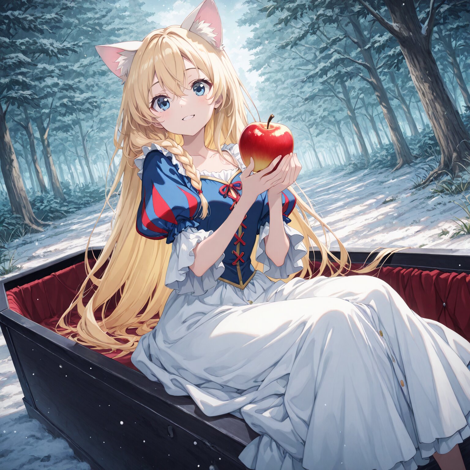 (1girl), young female, long hair, blonde hair, braid, blonde cat ears, blue eyes, hair between eyes, Snow White, Snow White dress Smiling, holding an apple Sitting on a coffin, with dwarfs at her feet,, many dwarfs singing In the forest BREAK, (newest, anime, animation, anime screen capture, anime style:1.3) BREAK, (masterpiece, , vibrant, very aesthetic, highly detailed, best quality, 16k:1.3)