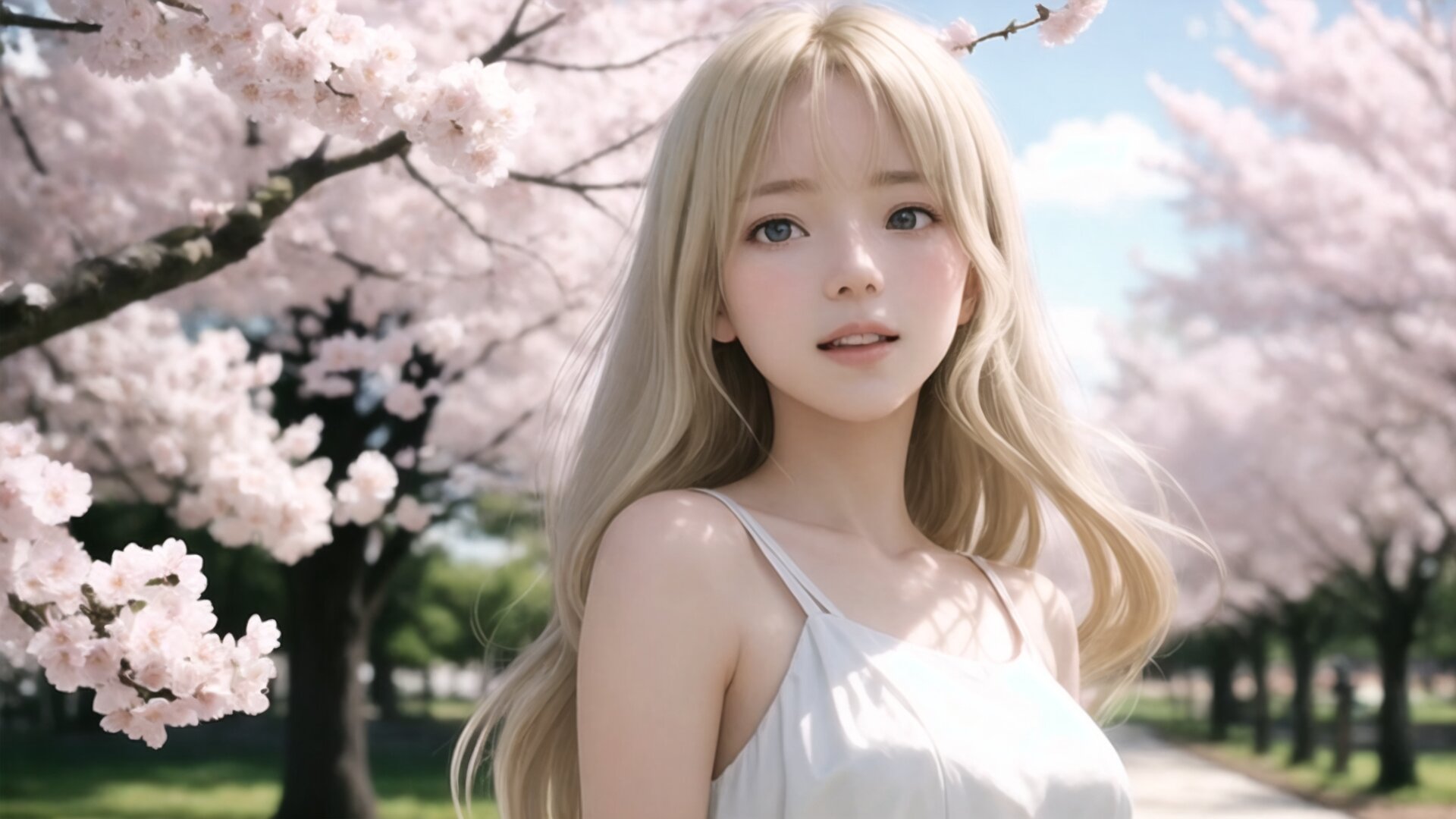 best quality, beautiful girl, 18yo, (1girl), (anime coloring), (anime screencap), ((gray eyes)), (blond hair:1.3), long hair, bangs, realistic eye, gigantic breasts, BREAK A spring gravure-style composition in a quiet park filled with soft cherry blossoms and fresh greenery. A young woman is framed in a medium-to-long shot, slightly off-center, walking slowly along a petal-covered path. She wears a light, flowing spring dress that gently outlines her silhouette, moving naturally in the breeze. Warm spring sunlight creates soft highlights on her hair and skin, with shallow depth of field and delicate background bokeh. The composition emphasizes natural posture, elegant body lines, leaving generous negative space for atmosphere. Photorealistic, cinematic lighting, ultra high resolution, soft focus, natural colors, editorial photography style. blush, roaring laughter, Orgasm dynamic angle, cowboy shot, from below,