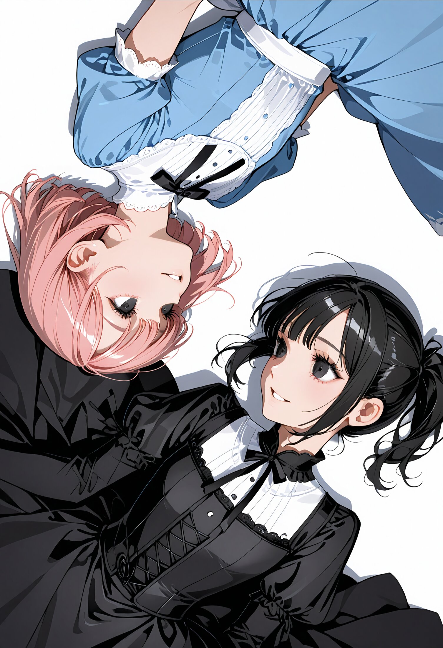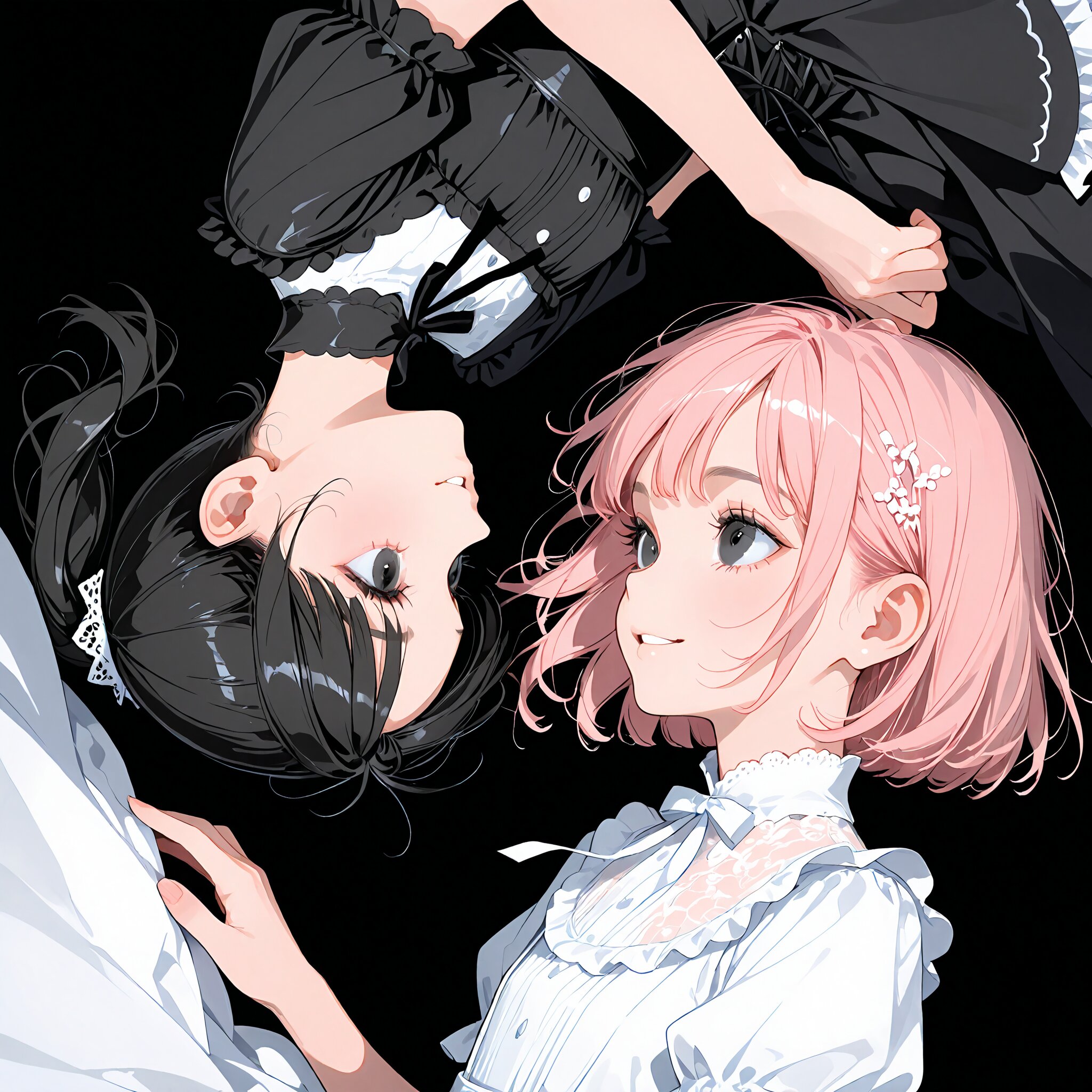 (rating: sensitive:1.2), score_9, score_8_up, score_7_up, score_6_up, source_anime, (delicate illustration), highly decorative, ((rotational symmetry, from side, looking away, upside-down)), dark side, white side, two-tone background, (black theme, white theme, flat color). in the style of “Alice's Adventures in Wonderland”, 2girls, multiple girls, lying on a cute decorated surface in perfect rotational symmetry. (a girl is black hair, clear black eyes, single short ponytail hair). (the other girl is pink hair, short bob). (gothic lolita fashion illustration, flat colors, ultra-intricate detailed), flat design, bold colors, patterned fabric, beautiful composition, in the style of cute anime girl. BREAK insanely beautiful and detailed gothic dress, extremely shiny hair, beautiful small face, big round eyes, beautiful detailed eyes, long eyelashes, double eyelids, parted lips, smile, kawaii, cute, flat chest, slender, {exquisitely delicate skin}. perfect anatomy, BREAK (masterpiece, aesthetic quality, 8K, ultra-detailed), whimsical color palette, (perfect design, realistic complex), absurdres, highres, hyperrealistic, photorealistic, cinematic lighting,