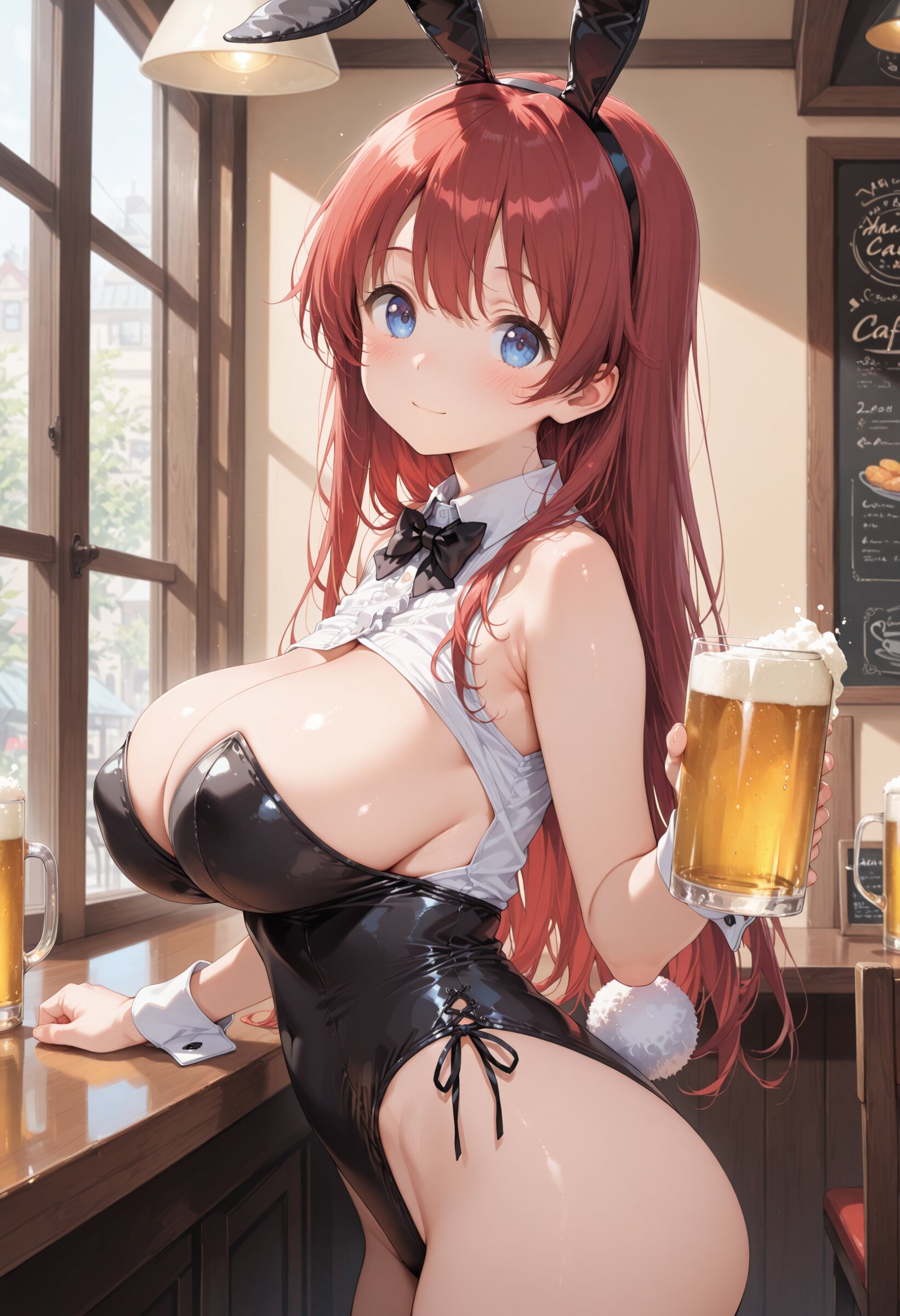 masterpiece, best quality, highres, ultra-detailed, extremely detailed, detailed, 1girl, loli, bunny girl, black leotard, red hair, long hair, blue eyes, big breasts, perky breasts, sleeveless, in cafe, relaxing, have a glass of beer, look at viewer, from side,