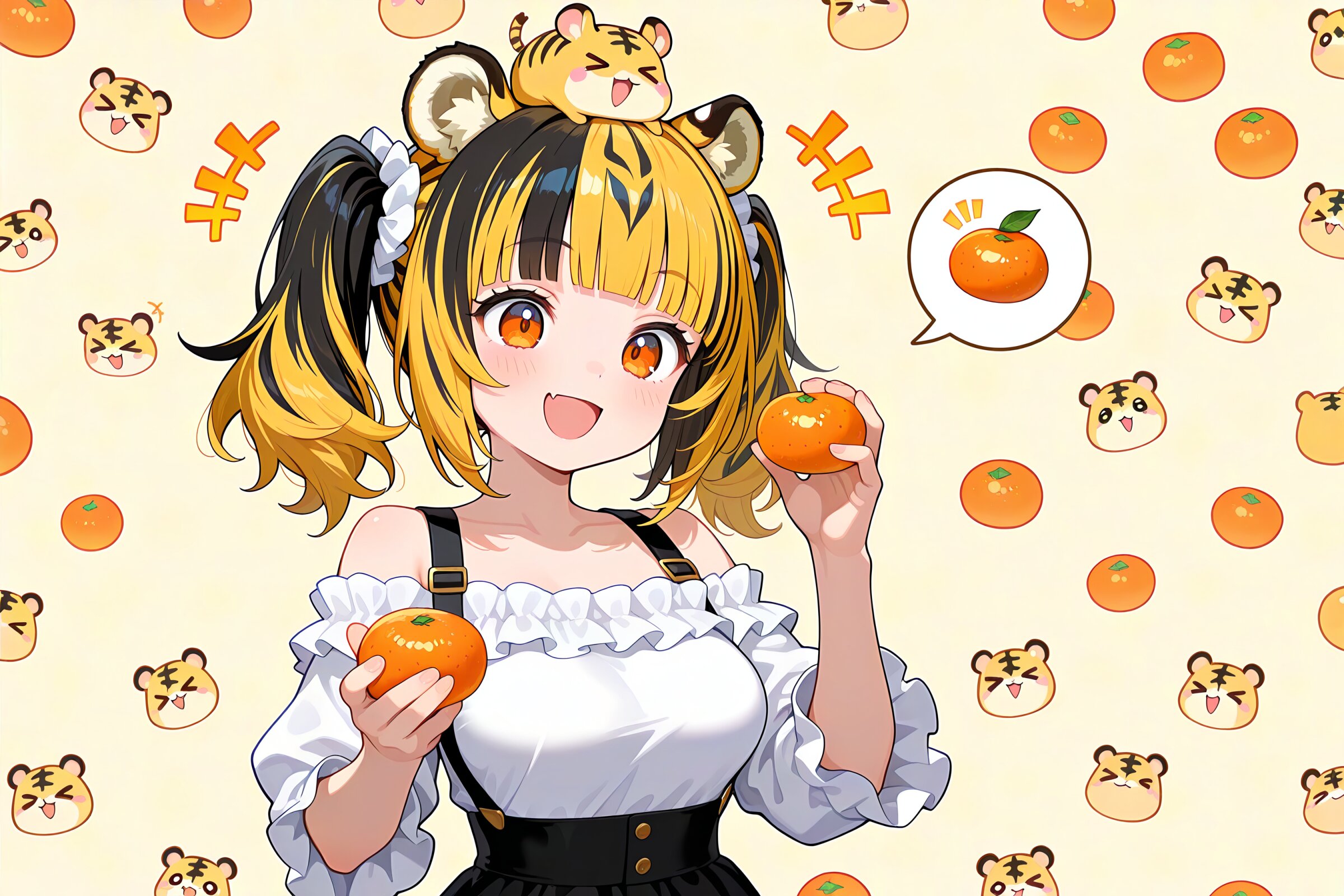 1 little girl, solo, masterpiece, best quality, amazing quality, very aesthetic, hamsters on her head,> <, multicolor hair, black hair, yellow hair, animal ears, tiger ears, medium hair, twintails, blunt bangs, medium breasts, orange eyes, tiger stripes, frills, off-shoulder shirt, suspender skirt, open mouth, smile, cheerful, +++, notice lines, holding mandarin orange, spoken food, tiger patterned background,